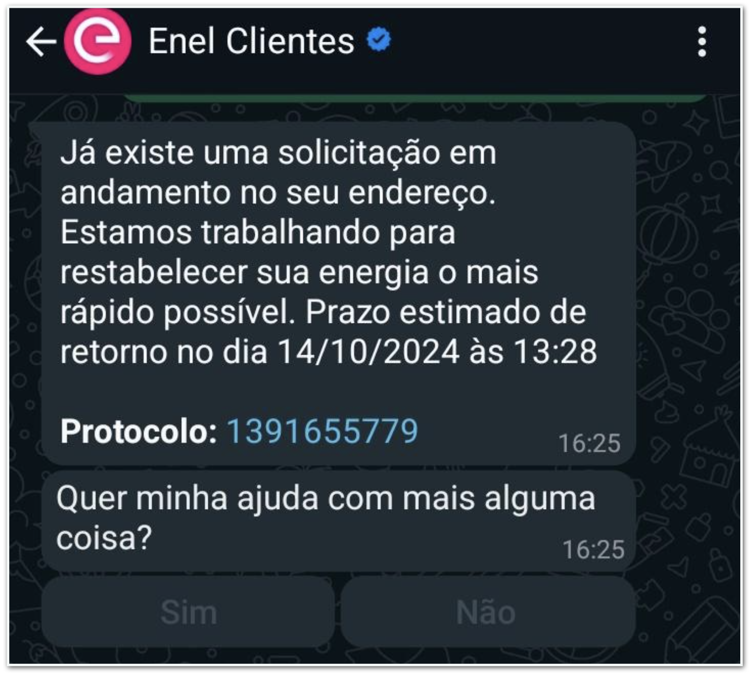 Em seus canais de atendimento, a Enel estima para os consumidores que a energia deve ser retomada apenas na 2ª feira (14.out).