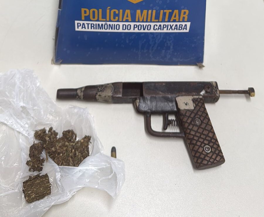 No local, os policiais apreenderam uma arma de fogo calibre .22 municiada, além de aproximadamente 11 gramas de maconha. Segundo a corporação, o adolescente assumiu a posse do material e confessou participação em um crime anterior, afirmando que teria adquirido a arma com a intenção de vingança.