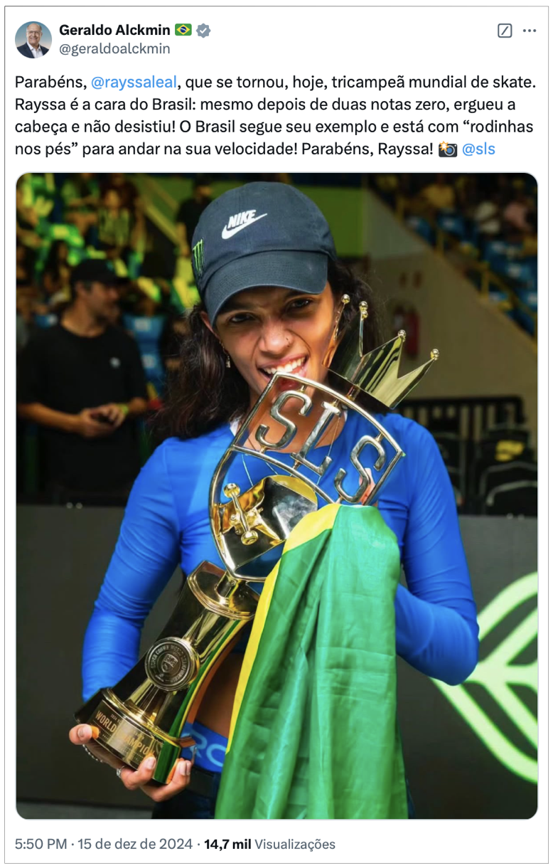 “Parabéns, @rayssaleal, que se tornou hoje tricampeã mundial de skate. Rayssa é a cara do Brasil: mesmo depois de duas notas zero, ergueu a cabeça e não desistiu! O Brasil segue seu exemplo e está com ‘rodinhas nos pés’ para andar na sua velocidade! Parabéns, Rayssa!”, escreveu Alckmin em suas redes sociais.