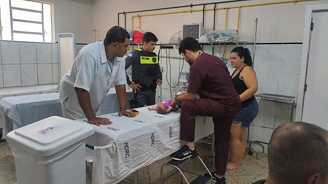 Com preparo técnico e precisão, os policiais iniciaram as manobras de desengasgo (conhecidas como Manobra de Heimlich para lactentes) ainda durante o trajeto até o Hospital Dr. Alceu Melgaço Filho.