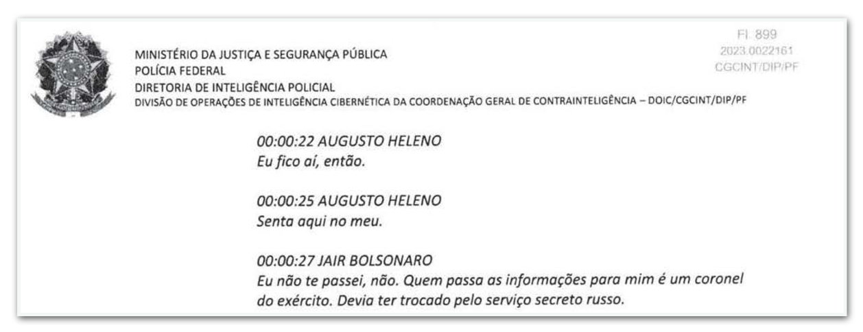 “Quem passa as informações pra mim é um coronel do Exército. Devia ter trocado pelo serviço secreto russo”, disse Bolsonaro em conversa com Augusto Heleno no começo da gravação.