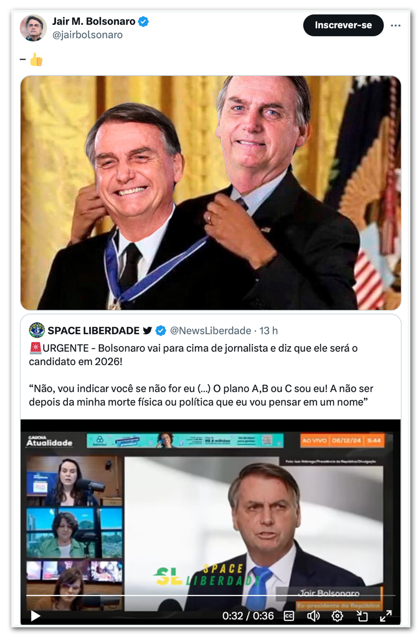 No X (ex-Twitter), o ex-presidente compartilhou o trecho da entrevista em que comenta a fala do filho. Com o vídeo, postou um meme.
