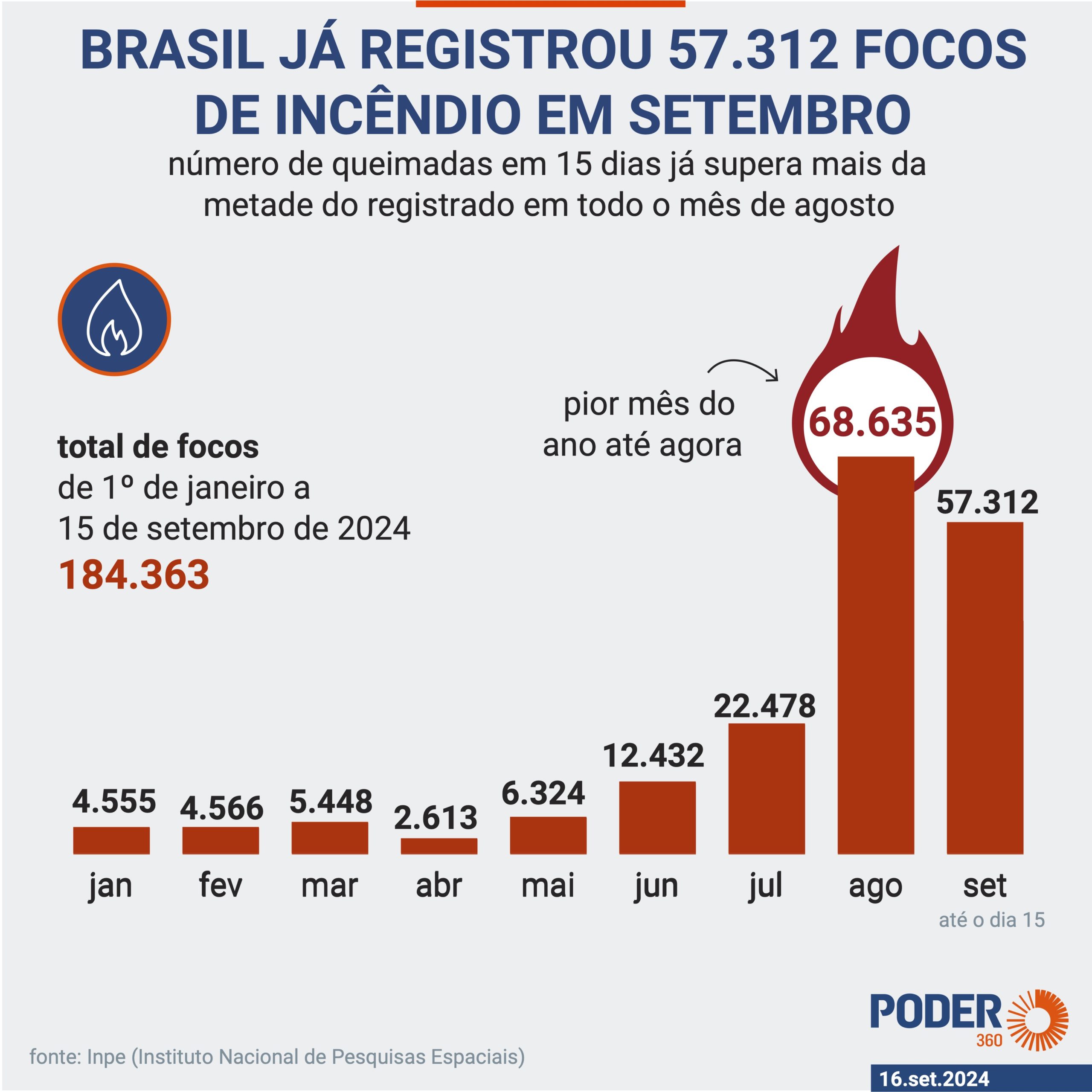Setembro já acumula 57.312 focos de incêndio. Em 2024, são 184.363 ocorrências do tipo.