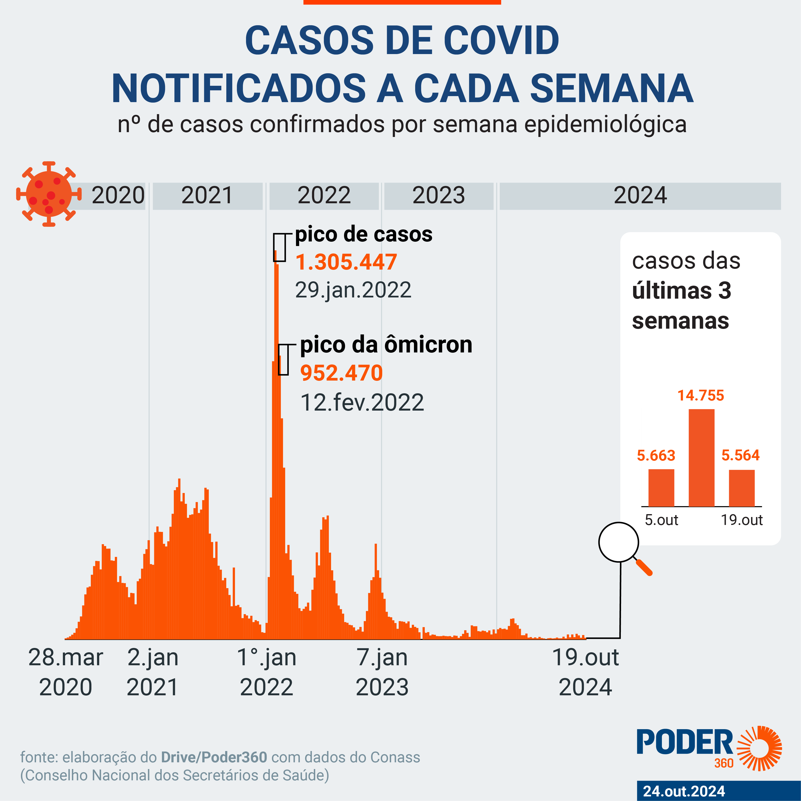 O Conass (Conselho Nacional de Secretários de Saúde) informou que foram contabilizados 5.564 novos casos de covid na última semana epidemiológica (13.out-19.out). No período anterior, foram 5.663 novos contágios.