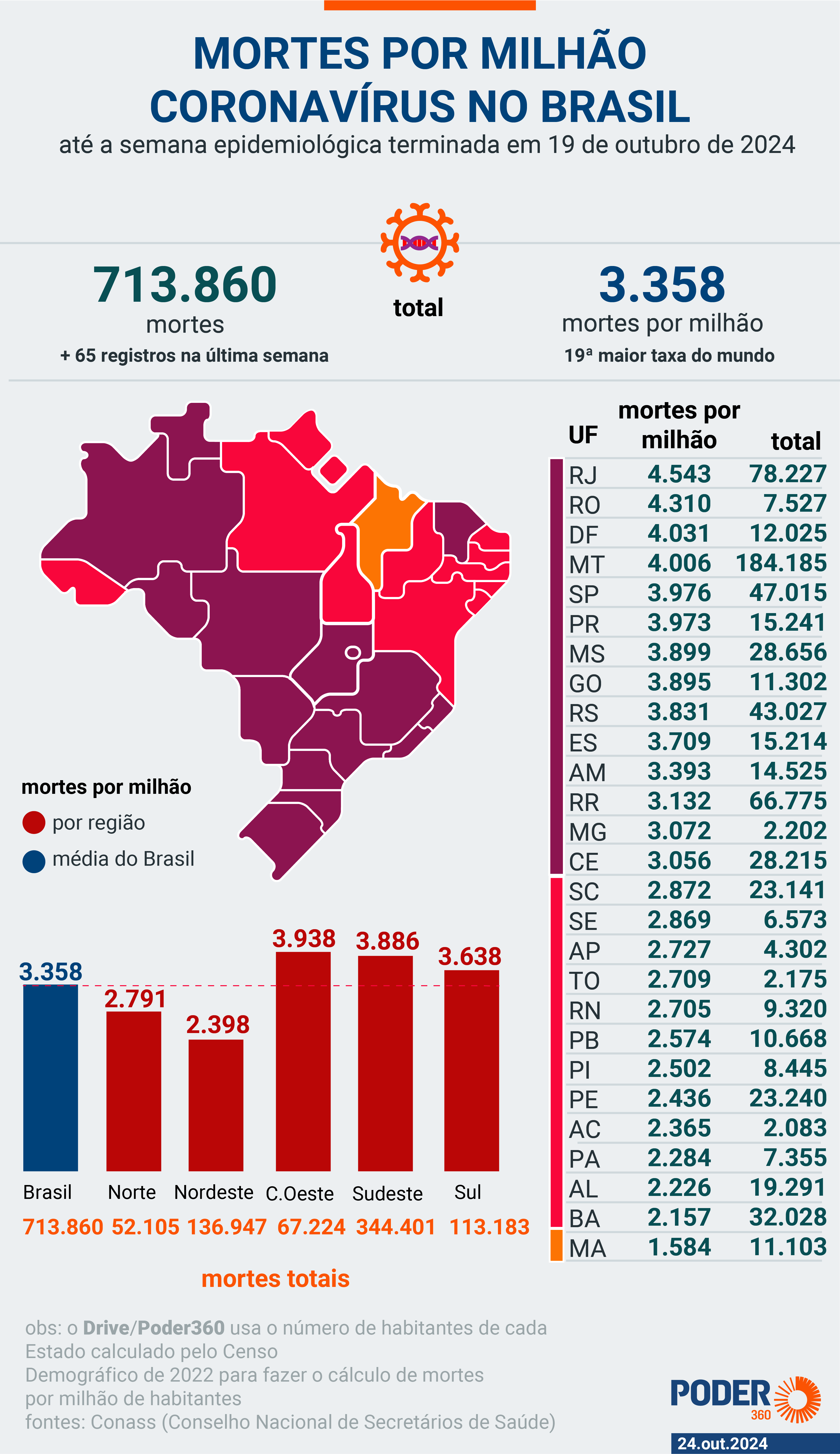 O Brasil registra 3.358 mortes por milhão. Dentre as unidades da Federação, a pior situação é a do Rio de Janeiro, com 4.543 vítimas por milhão. As taxas consideram o número de mortes confirmadas pelo Conass e os dados populacionais do IBGE (Instituto Brasileiro de Geografia e Estatística) em cada unidade da Federação.