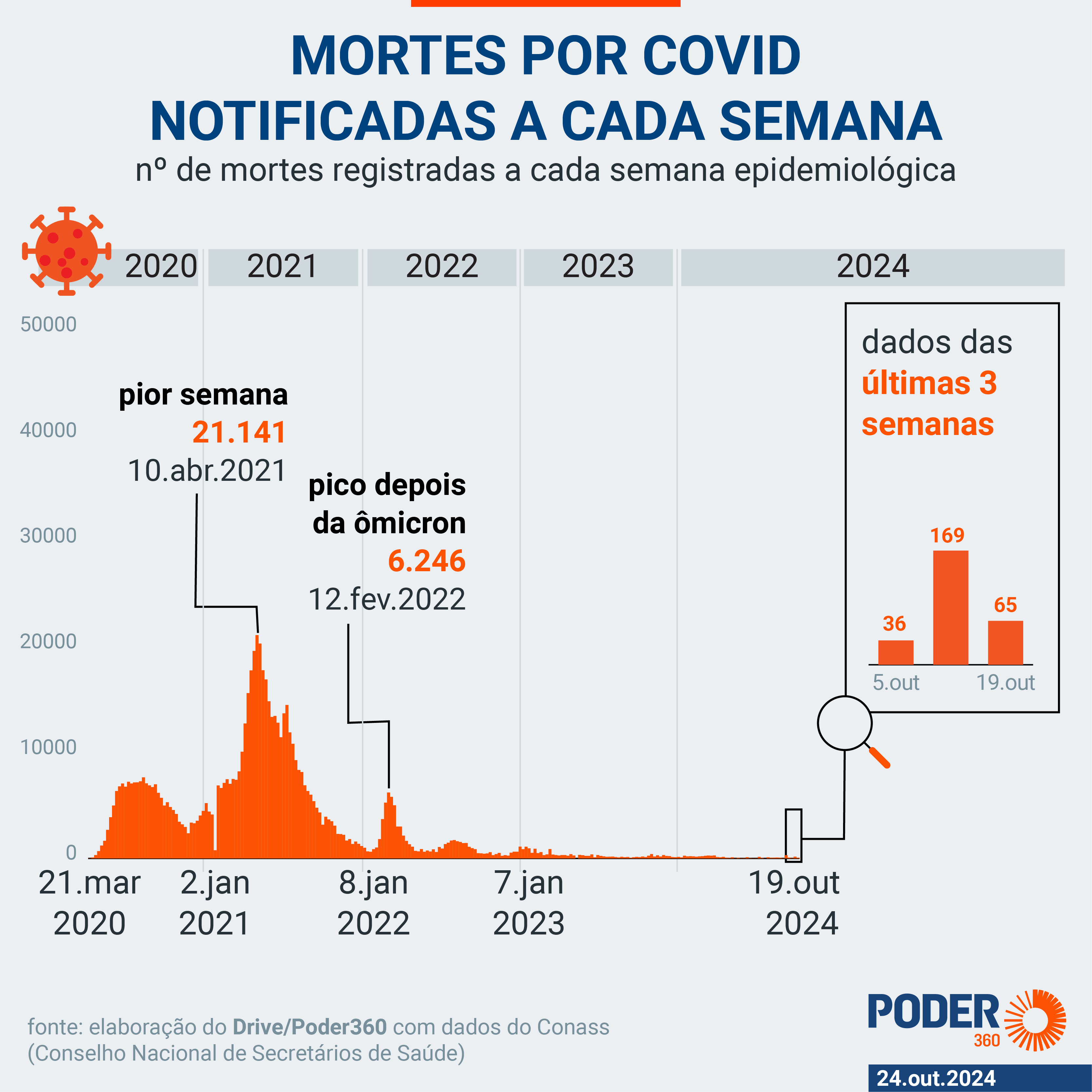 O Poder360 utiliza os dados do Our World in Data, plataforma que centraliza os dados referentes à covid-19 do mundo. Os dados disponibilizados nesta 5ª feira (24.out.2024) foram atualizados em 6 de outubro pela última vez. Por isso, este jornal digital optou por não atualizar o infográfico. Para acessar a última versão da relação de casos leia esta reportagem.