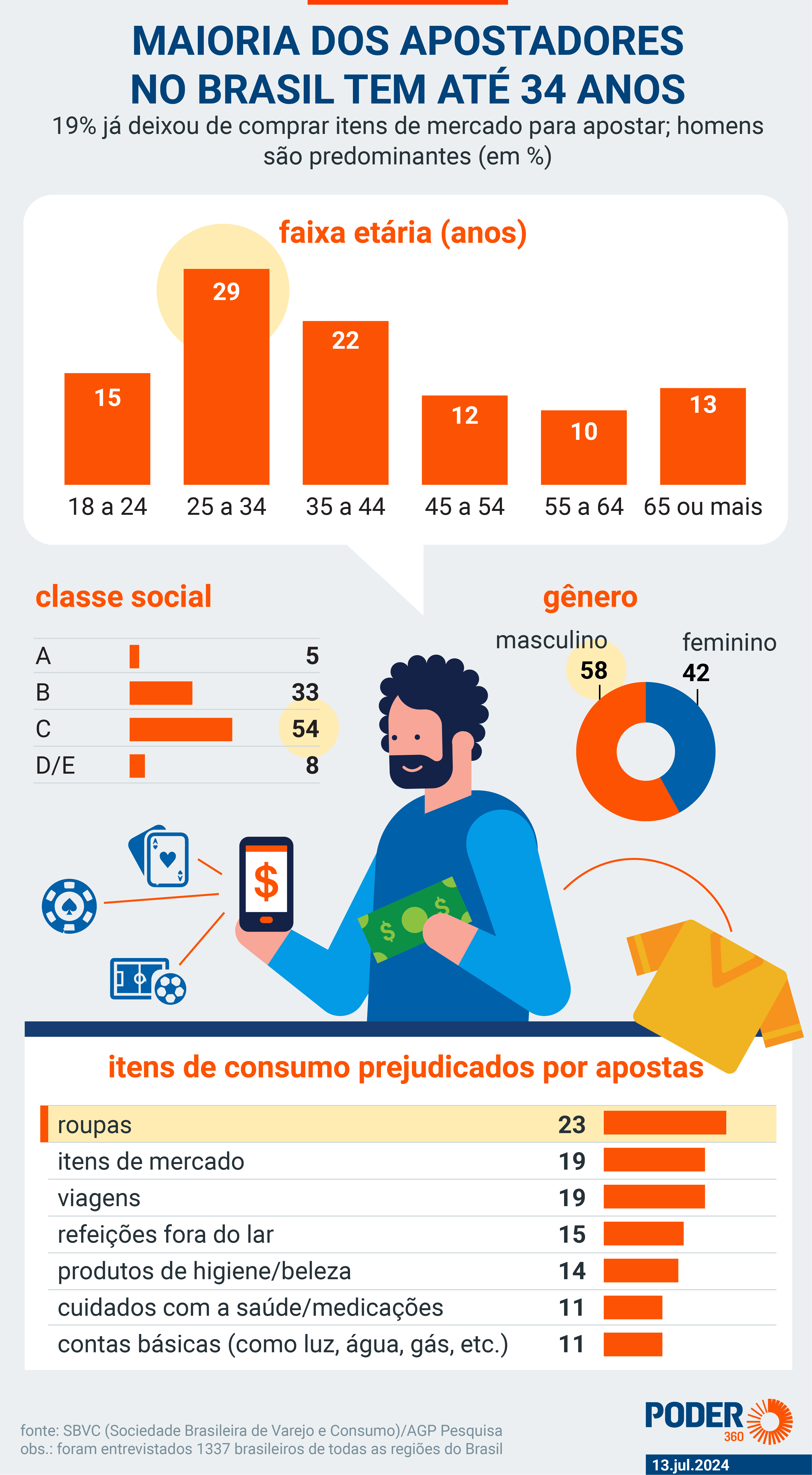 O perfil médio do apostador brasileiro das chamadas bets, ou apostas esportivas, é homem, do Sudeste e de classe B ou C. Segundo o estudo, 64% de quem aposta online no Brasil afirma utilizar a renda principal para realizar as apostas on-line e 63% diz que teve parte do orçamento comprometido.