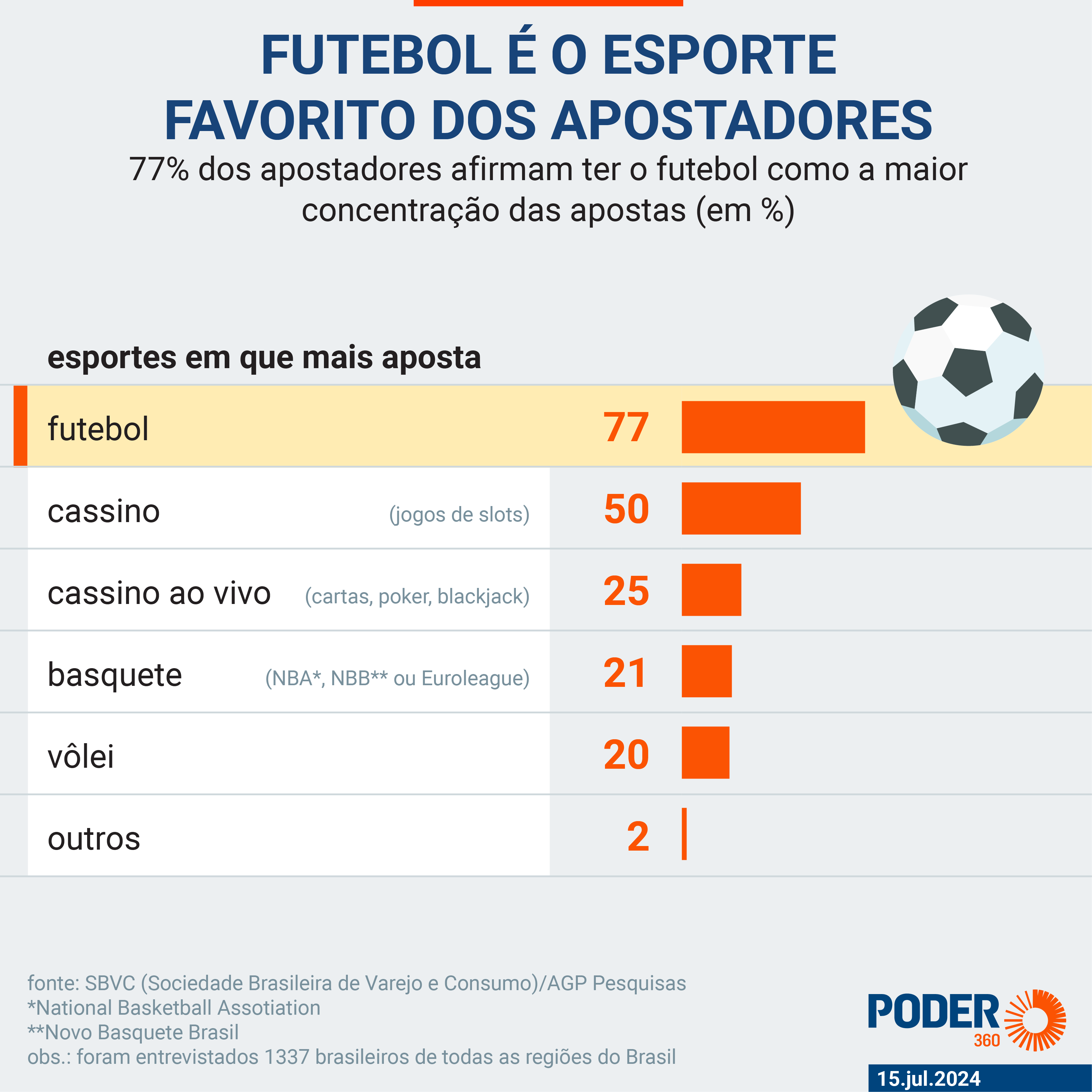 Dentre as diversas modalidades de apostas esportivas disponíveis, os resultados de futebol continuam a ser a favorita dos brasileiros, com 77% das apostas concentradas nesta categoria.
