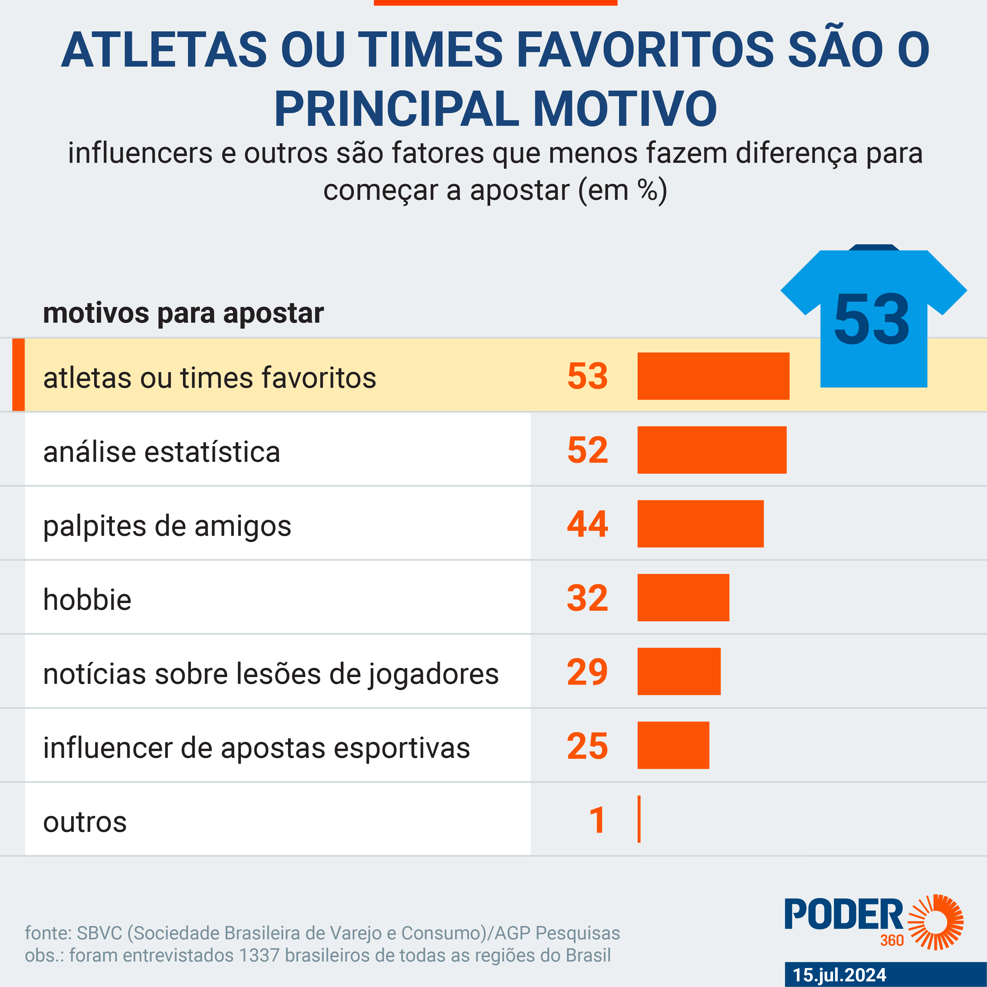 Diversos fatores influenciam a decisão dos apostadores na hora de fazer uma aposta. Apostar em atletas ou times favoritos é o principal, tendo sido apontado por 53% dos entrevistados. O levantamento mostrou, ainda, que dentre as categorias especificadas, os influenciadores que incentivam apostas são a que menos faz diferença para o apostador (25%).