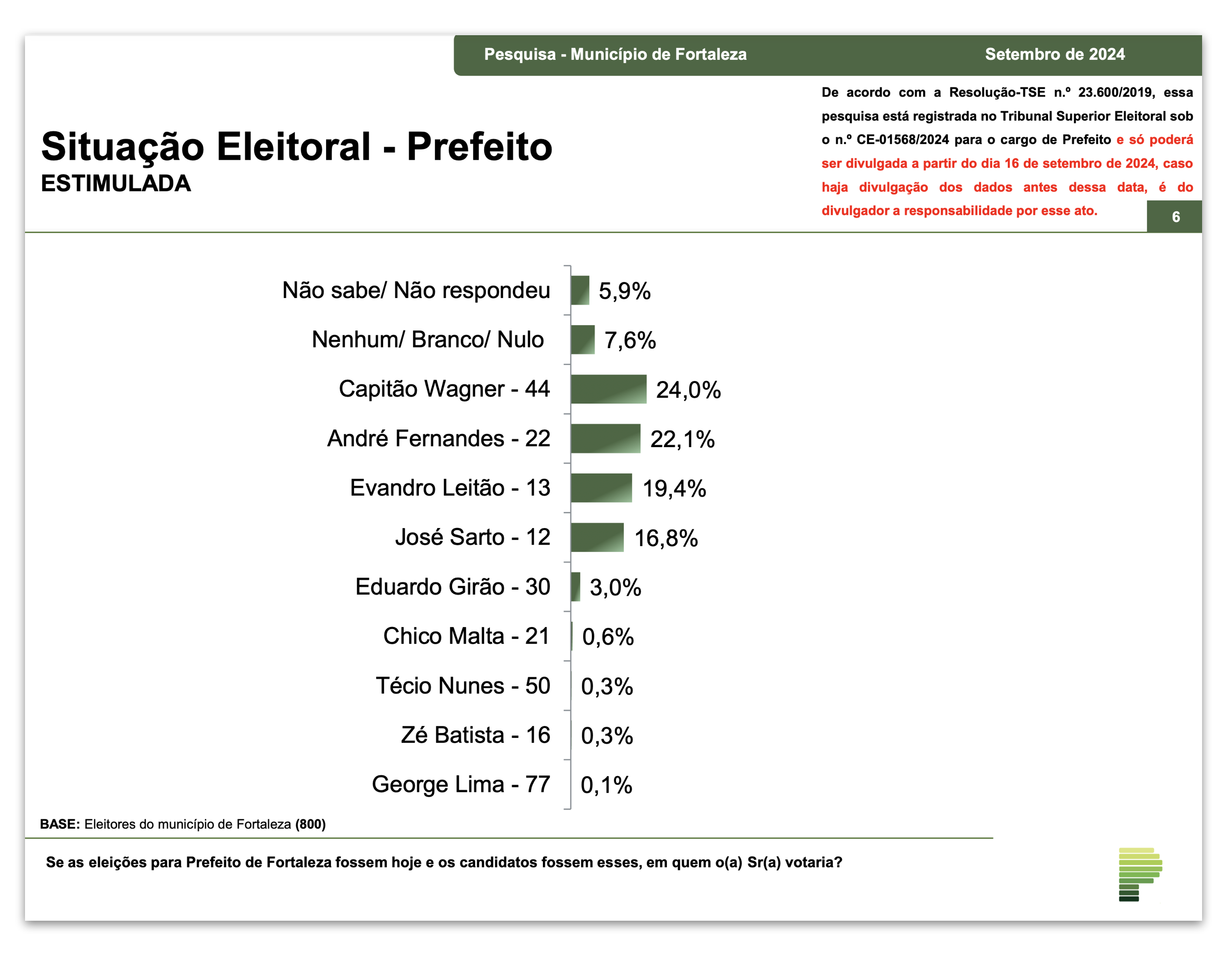 O candidato do União Brasil tem 24% das intenções de voto, enquanto Fernandes tem 22,1% e Leitão, 19,4%. Em seguida, estão o atual prefeito da capital cearense, José Sarto (PDT), com 16,8%; e o senador Eduardo Girão (Novo), com 3%.