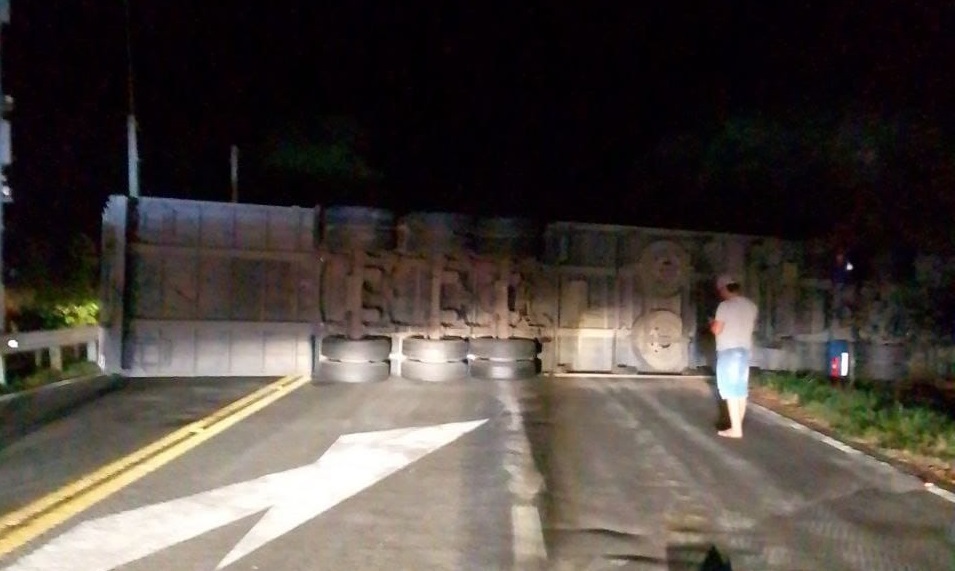 A Polícia Rodoviária Federal está coordenando o trânsito no km 450 da BR-101 em Mimoso do Sul, onde uma carreta carregada de aparelhos de ar condicionado tombou no meio da pista, interditando totalmente a rodovia. O acidente aconteceu por volta das 23h10, e o transbordo da carga só foi iniciado às 2h.