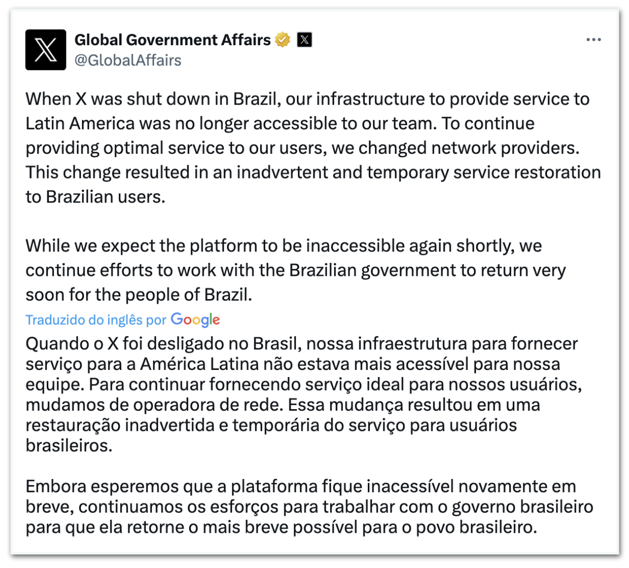 Moraes determinou a suspensão do X no Brasil. No entanto, brasileiros que estão no exterior seguem com acesso normal à plataforma. Foi desta maneira que o Poder360 leu a mensagem postada pela rede social e replica neste texto, por ser de interesse público e ter relevância jornalística.
