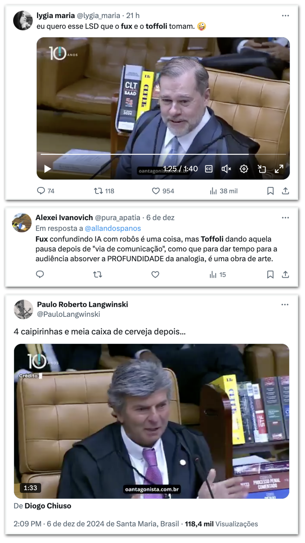 - Luiz Fux – “Quem reproduz essas informações todas é o [ininteligível]. Nós estamos tratando de liberdade de expressão de pessoas, quando, na verdade, no fundo, no fundo, o grande protagonista dessa circulação de todas essas informações, falsa ou verdade, ou dirigida para as bolhas, é a inteligência artificial. A culpa é do robô”;