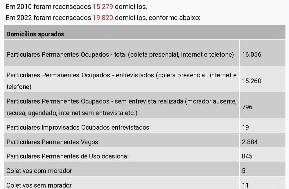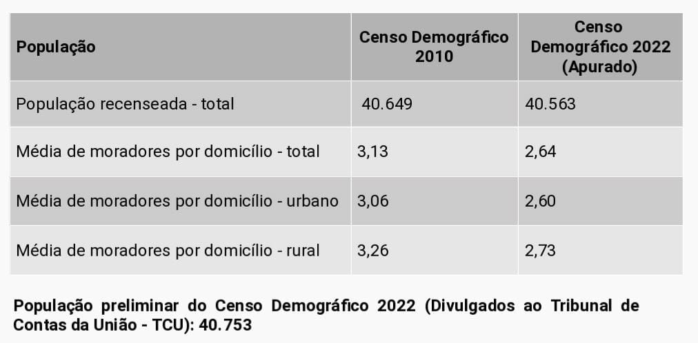 Os dados mostram uma situação preocupante para o município, que já questionou judicialmente o uso dos dados do Censo 2022 para efeito de cálculo de repasse do Fundo de Participação dos Municípios (FPM). De acordo com o relatório preliminar do IBGE, houve uma queda de 0,21% na população recenseada agora na comparação com 2010, último censo realizado.