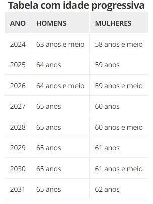Nesta categoria, a idade mínima para se aposentar é progressiva e sobe seis meses anualmente. Além disso, é exigido um tempo mínimo de contribuição, de 30 anos para as mulheres e de 35 para os homens.