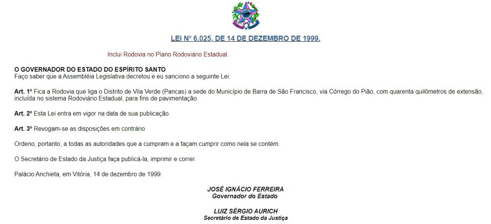 Não é bem assim. Na verdade, o que um sobrinho do agricultor e feirante descobriu, pesquisando no Google, e que pouca gente sabe, é que parte da ES-320 já tem nome e foi ‘transformada’ em rodovia estadual no final de 1999.