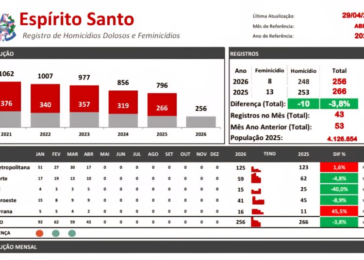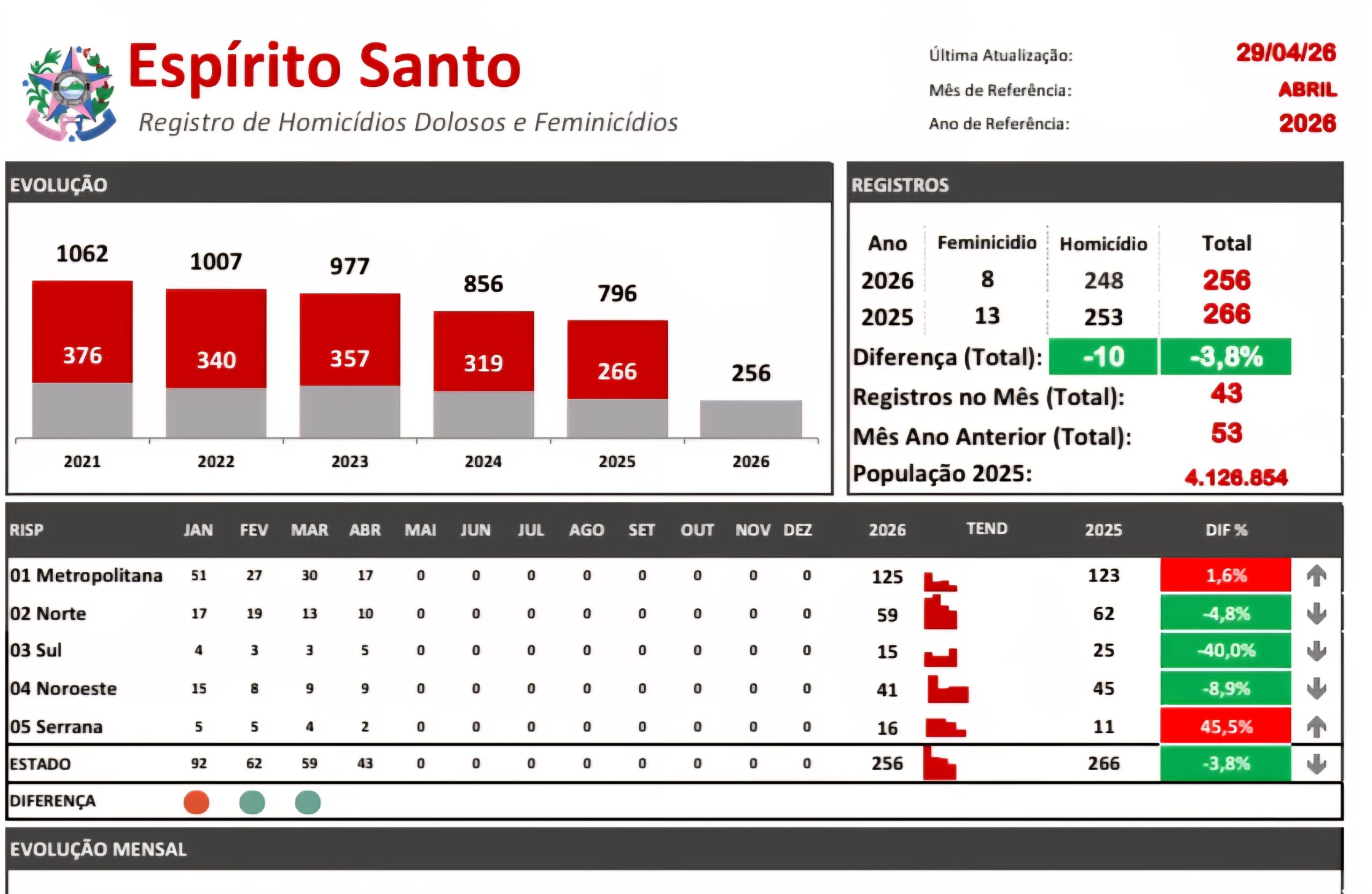 Foram 248 homicídios nesse perído, dez a menos que no mesmo período de 2026, projetando o fechamento do ano abaixo de 750. No ano de 2025, o Espírito Santo fechou com 798 homicídios, que foi 6,7% do que em 2024. A série histórica começa em 1996.