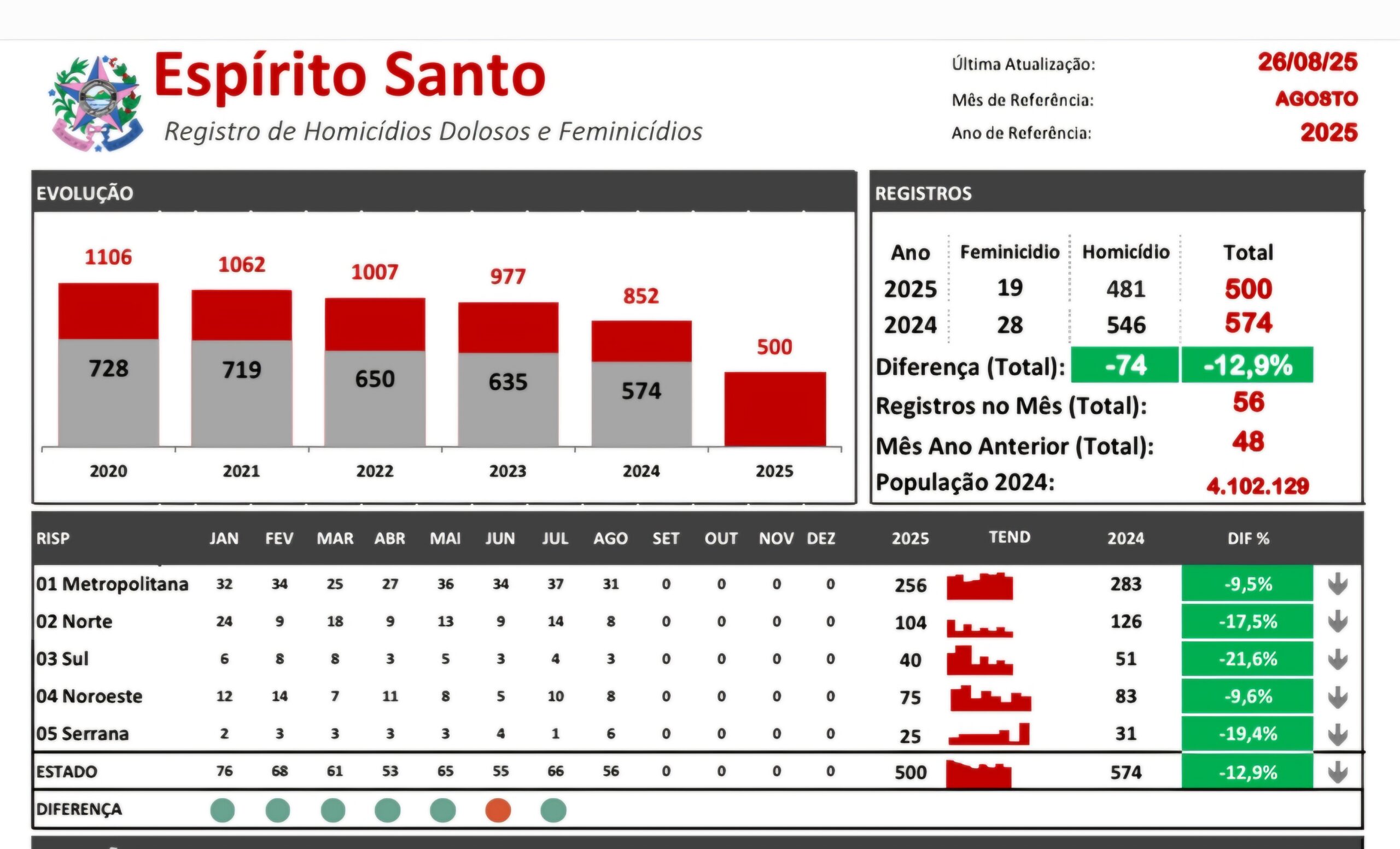 O número de homícidios no Estado chegou a 500 em 2025. No ano passado, essa marcada foi alcançada (e ultrapassada) no dia 21 de julho. Portanto, há um “delei” de 35 dias em 2025 em relação a 2024.