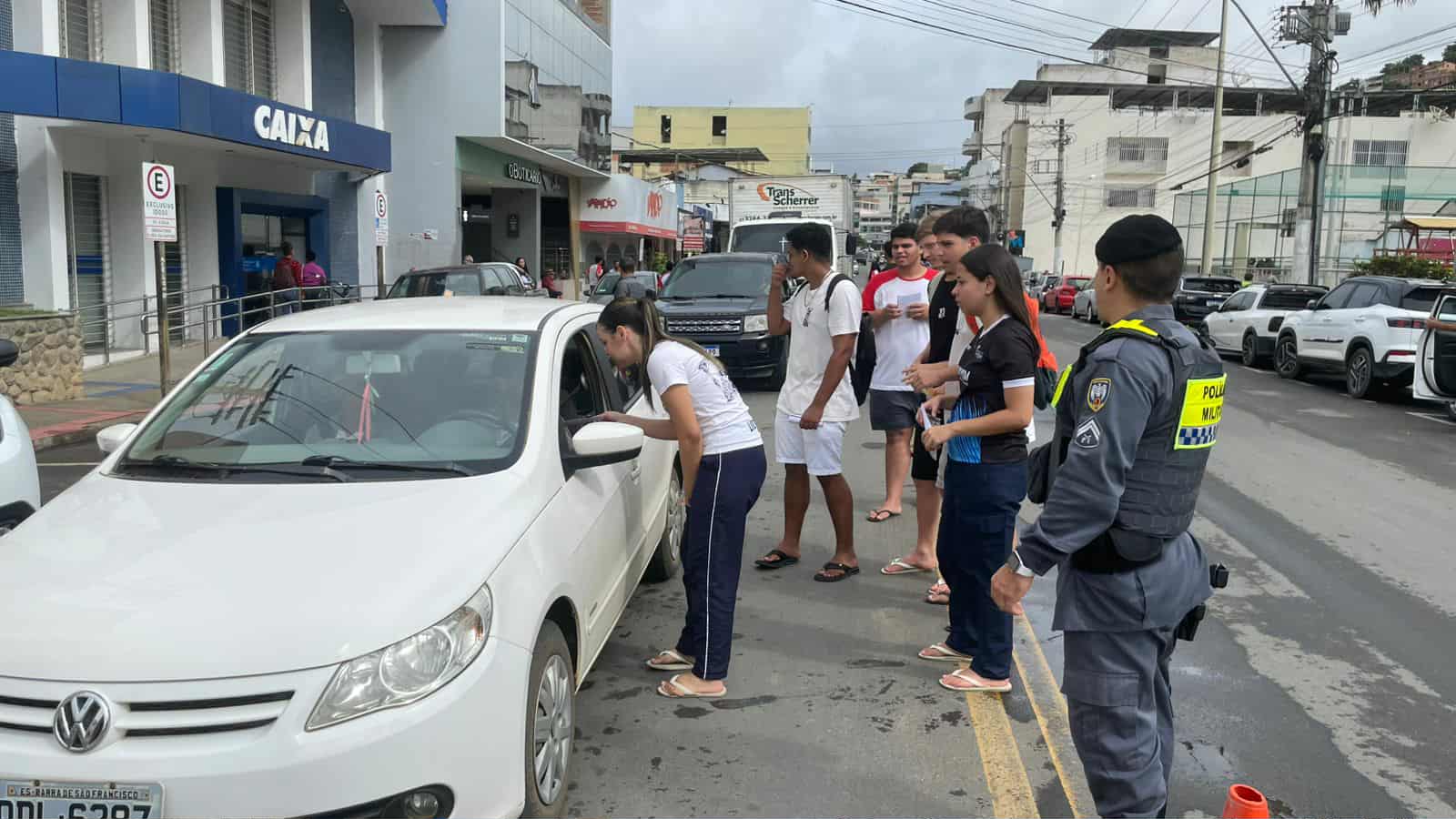 Alunos do Ensino Médio do Centro Estadual de Ensino Fundamental e Médio em Tempo Integral (CEEFMTI) João XXIII, no bairro Campo Novo, participaram nesta quinta-feira (9) de uma ação educativa no centro de Barra de São Francisco para conscientizar motoristas e pedestres sobre segurança no trânsito.