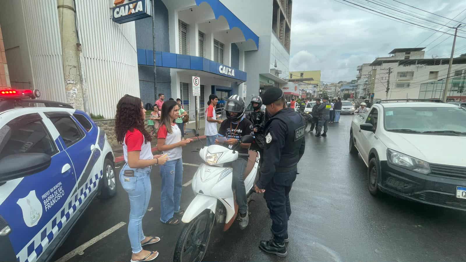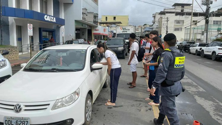 A atividade aconteceu na Avenida Edson Henrique Pereira, perto do semáforo da Praça Arlindo Pinto da Costa, e reuniu estudantes da disciplina “Projeto de Vida”, que aproveitaram o momento para distribuir panfletos e conversar com a população sobre o tema. A iniciativa também buscou aproximar os jovens das carreiras ligadas à segurança pública.