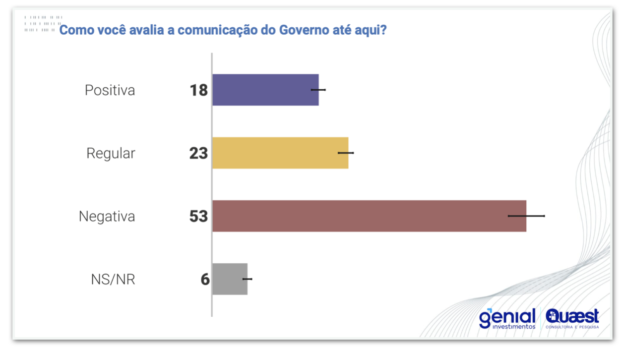 Outra crítica dos brasileiros é a estratégia de comunicação utilizada pelo governo Lula. Segundo o levantamento, mais da metade (53%) dos entrevistados disseram avaliar como negativa.