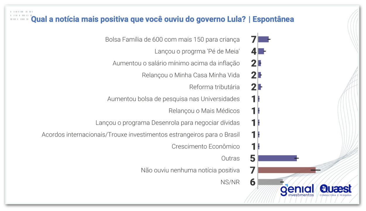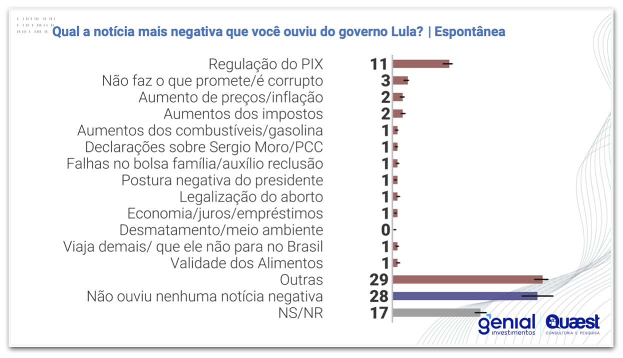 A regulação do Pix encabeça a lista das piores notícias, com 11%, enquanto o aumento do Bolsa Família é a melhor notícia, com 7%.