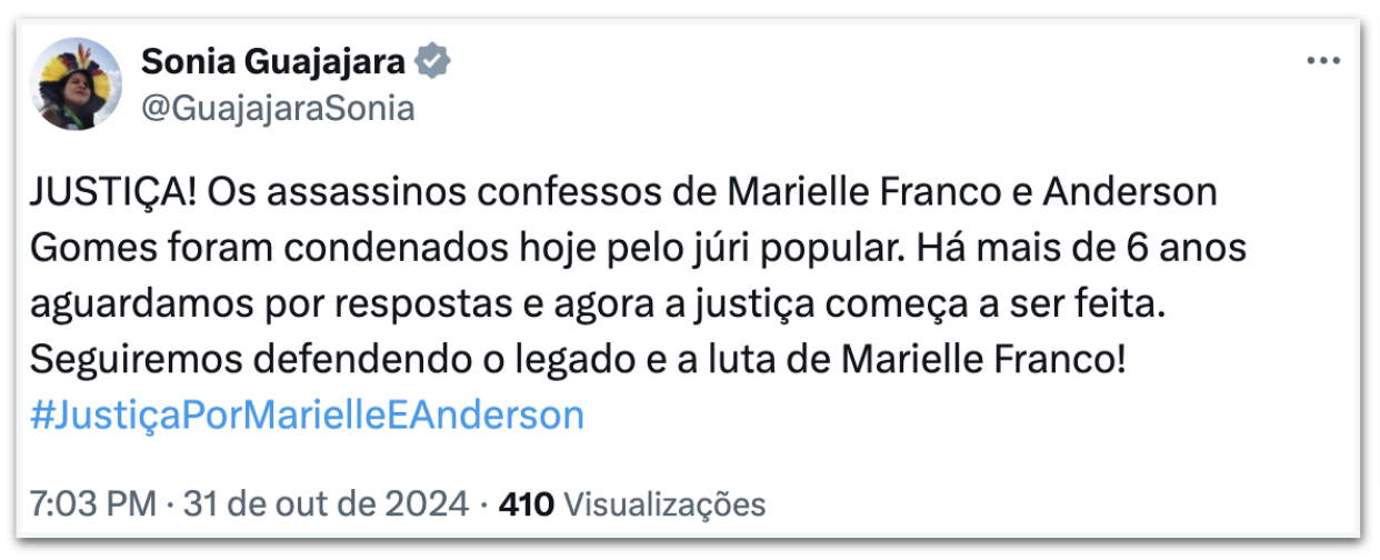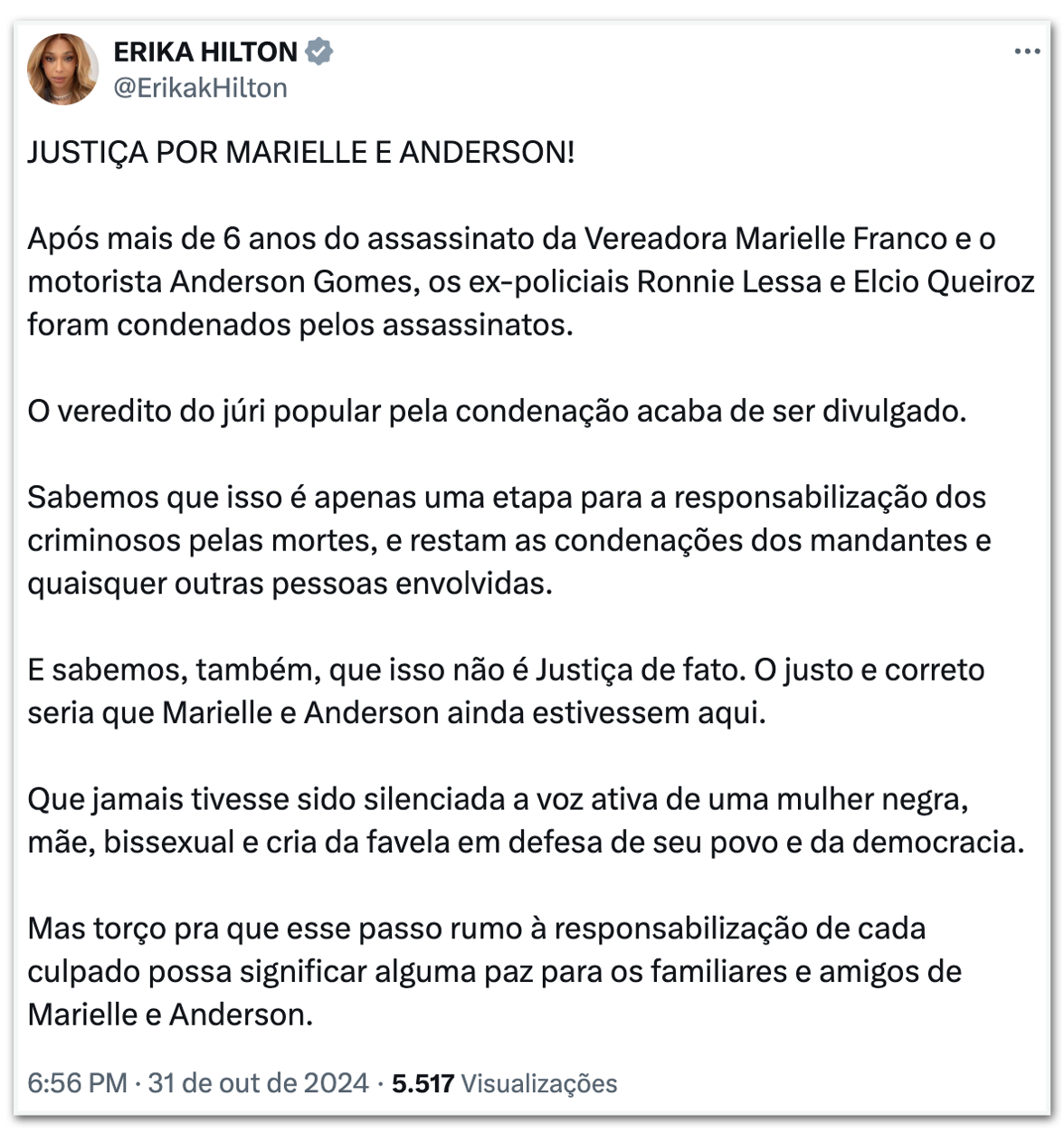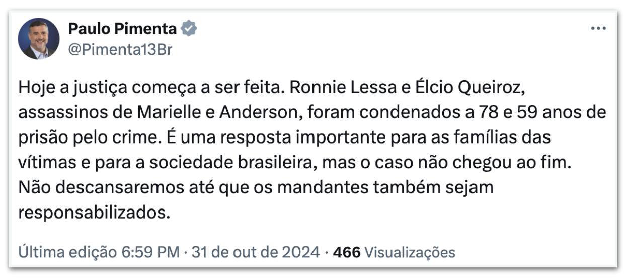 O presidente da Embratur (Agência Brasileira de Promoção Internacional do Turismo) e amigo de Marielle Franco (Psol), Marcelo Freixo (PT-RJ), e governistas comemoraram a condenação dos assassinos da vereadora do Rio. Os ex-policiais Ronnie Lessa e Élcio Queiroz foram condenados a 78 anos e 59 anos de prisão, respectivamente. A sentença foi decidida por júri popular no 4º Tribunal do Júri do Rio de Janeiro.