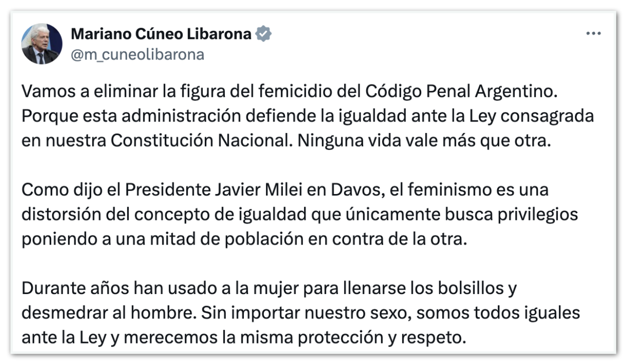 O ministro da Justiça da Argentina, Mariano Cúneo Libarona, disse na 6ª feira (24.jan.2025) que o governo do presidente Javier Milei avalia a retirada do feminicídio do Código Penal do país.