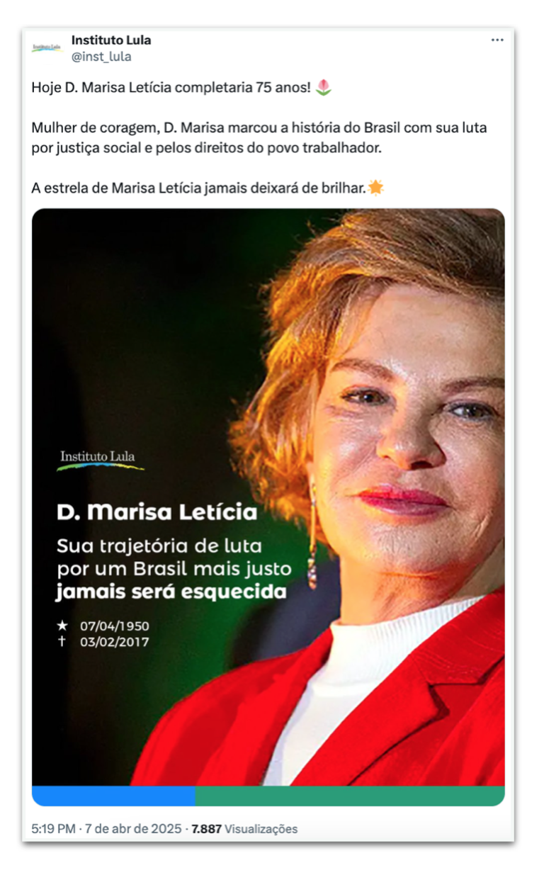 Em publicação no perfil oficial no X, o Instituto  afirma: “Mulher de coragem, D. Marisa marcou a história do Brasil com sua luta por justiça social e pelos direitos do povo trabalhador. A estrela de Marisa Letícia jamais deixará de brilhar”.
