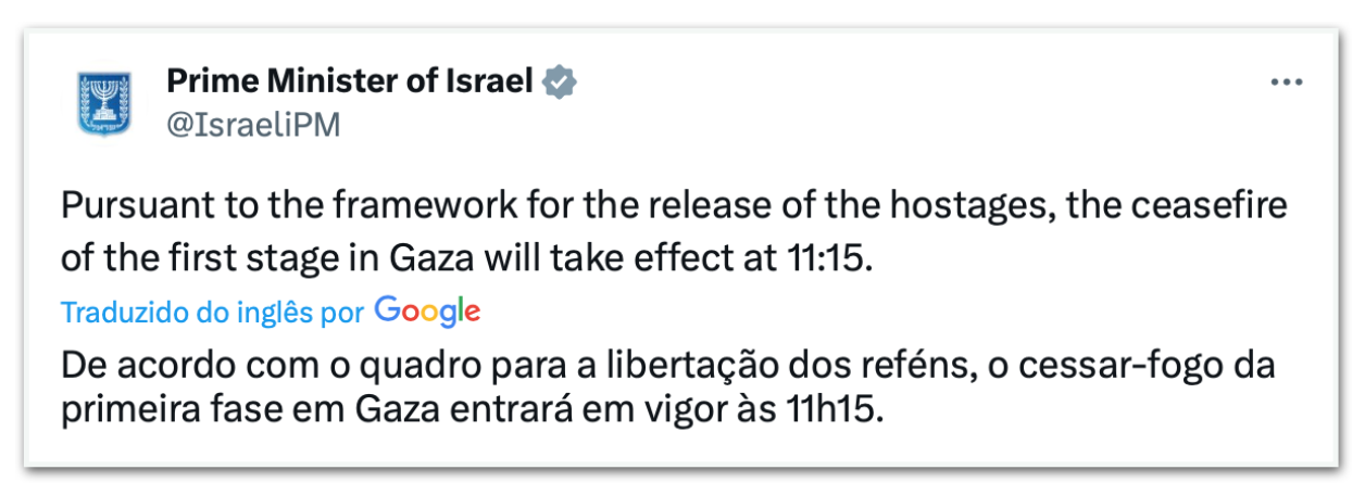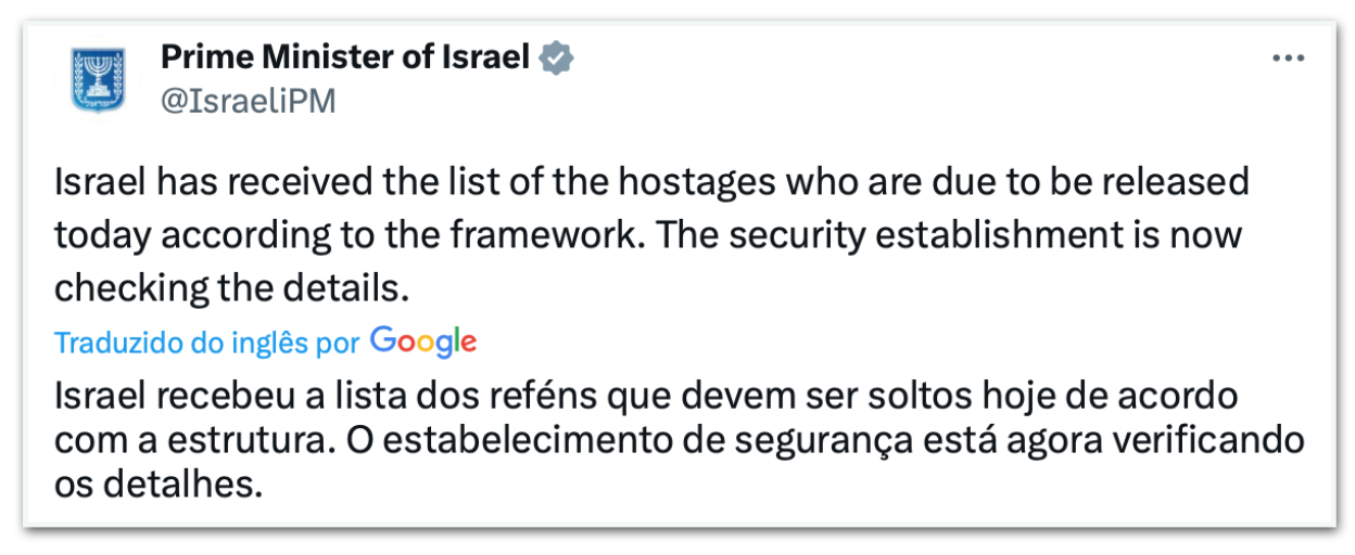Por volta das 6h15,o governo do primeiro-ministro de Israel, Benjamin Netanyahu (Likud, direita), confirmou no X (ex-Twitter) ter recebido a lista dos reféns e que o cessar-fogo teria início.