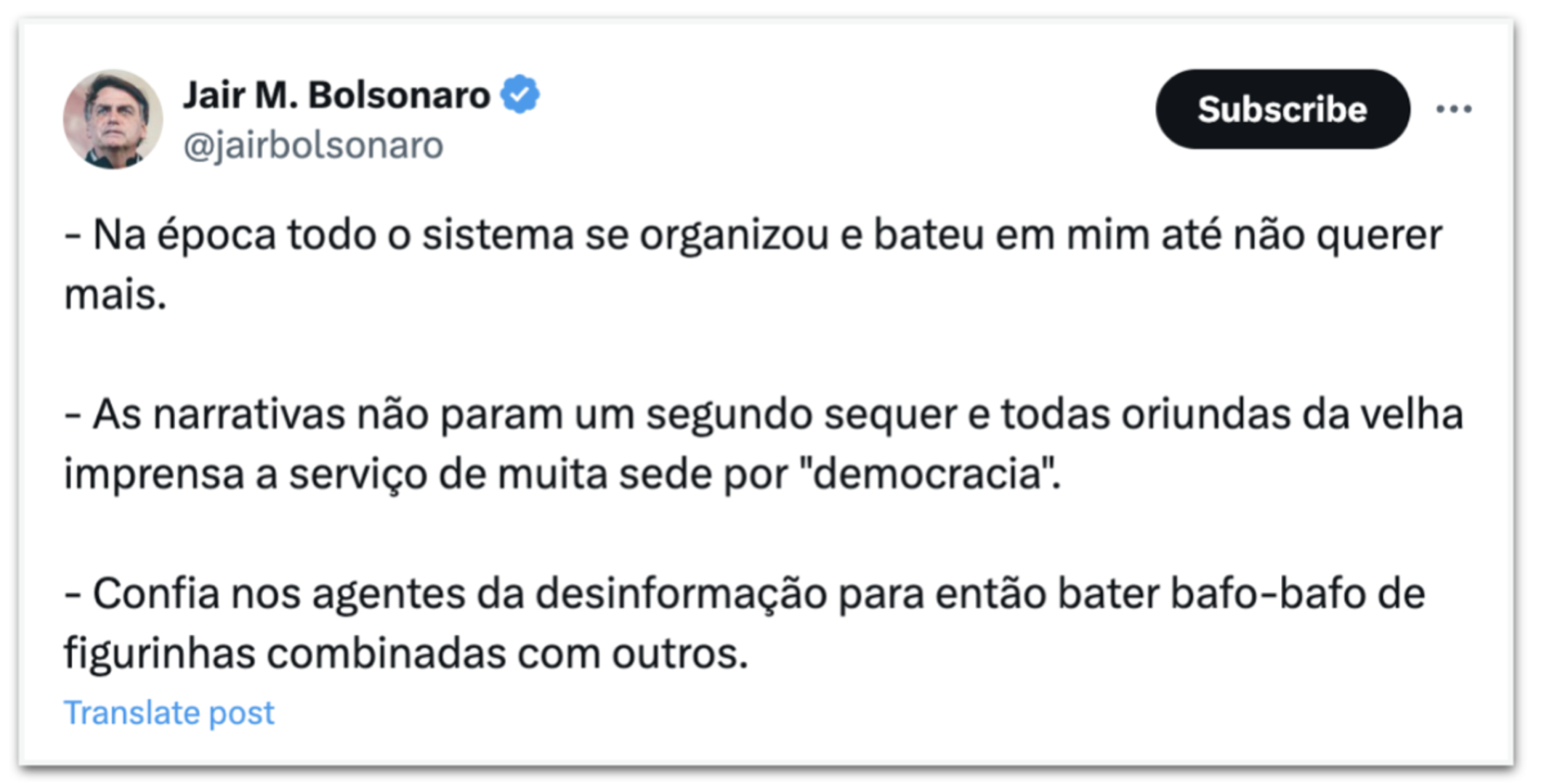Em seu perfil no X (ex-Twitter), Bolsonaro compartilhou a notícia. Disse que o sistema bateu nele “até não querer mais” e criticou “agentes da desinformação”, sem mencionar de maneira explícita a quem está se referindo.