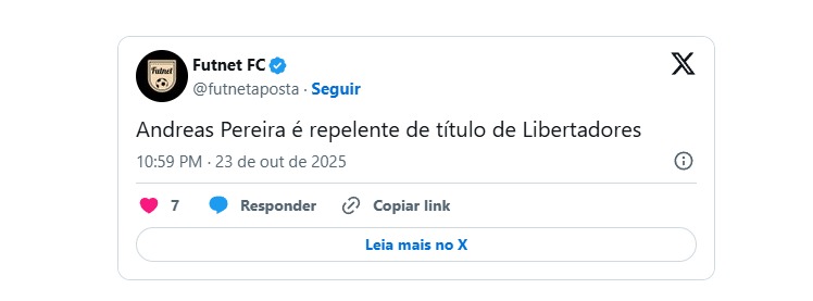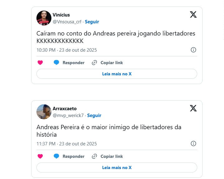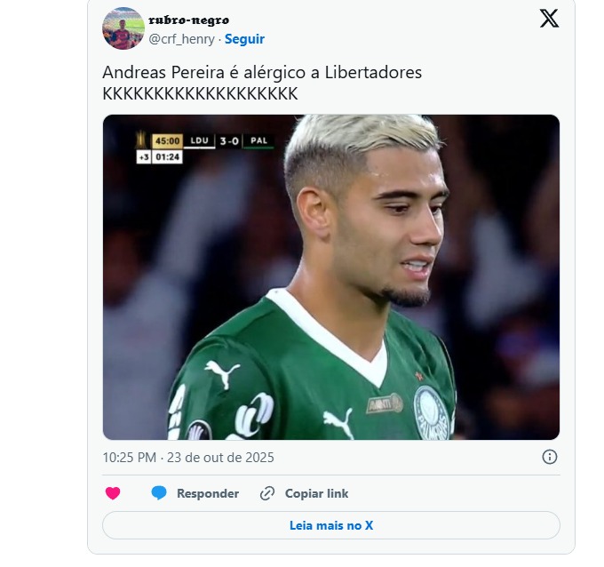 Logo após o lance, Andreas virou alvo de piadas nas redes sociais. Torcedores do Flamengo, clube onde o jogador ficou marcado por um erro decisivo na final da Libertadores de 2022, justamente contra o Palmeiras, aproveitaram o momento para provocar o ex-rubro-negro.