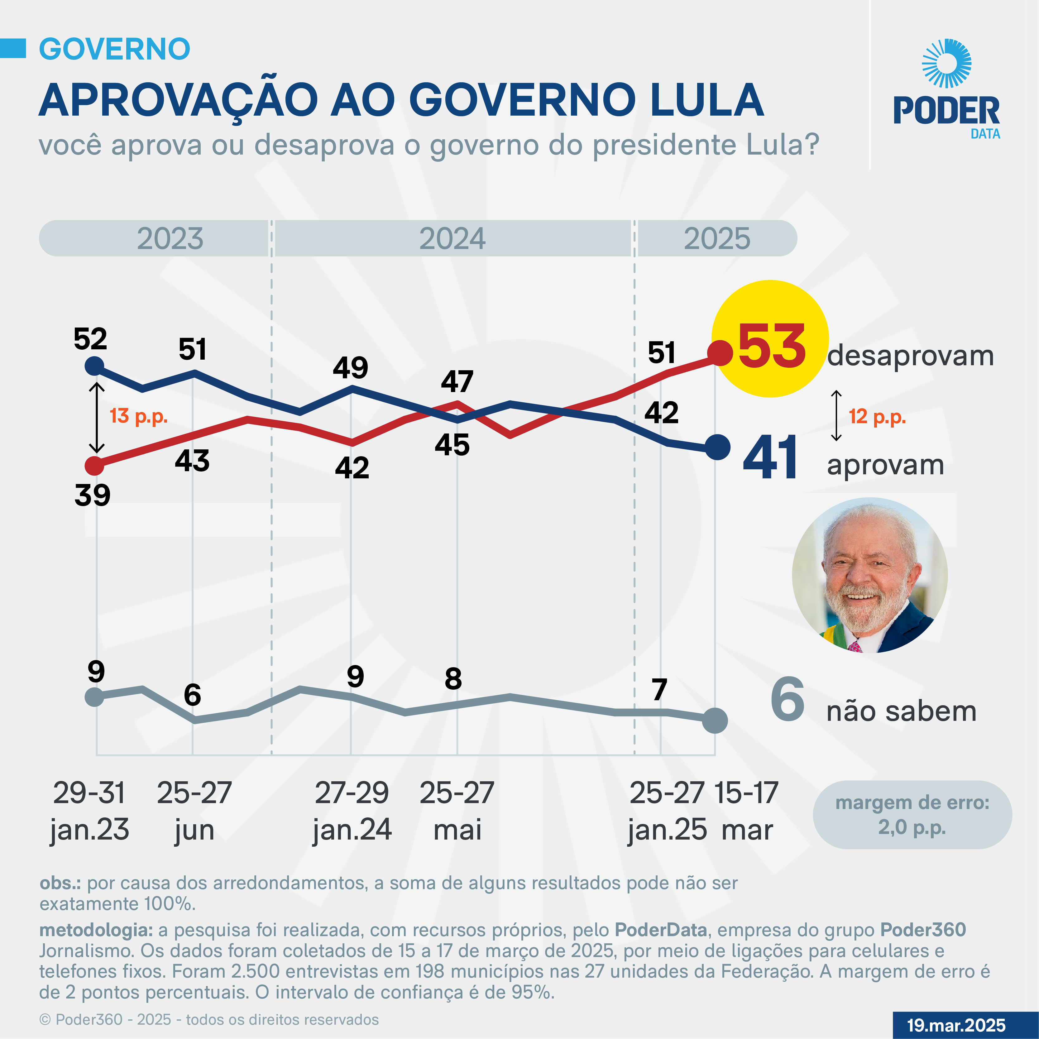 Pesquisa PoderData realizada de 15 a 17 de março de 2025 mostrou que 53% dos brasileiros desaprovam o trabalho do presidente, enquanto 41% aprovam. Leia abaixo a estratificação por renda familiar: