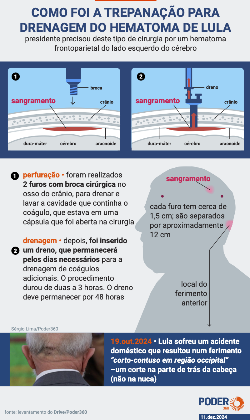 O presidente passou por 2 procedimentos na cabeça desde 10 de dezembro de 2024: uma trepanação craniana e uma embolização da artéria meníngea média. Na última cirurgia, foram feitos 2 furos com broca cirúrgica no crânio de Lula. Os buracos têm cerca de 1 cm a 1,5 cm cada um de diâmetro.
