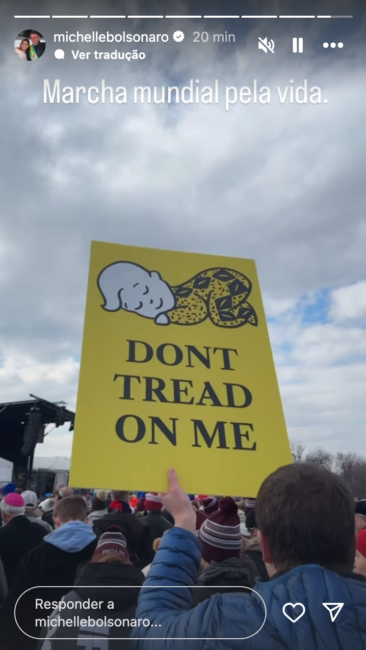 A ex-primeira-dama compartilhou imagens da marcha, focando em um cartaz escrito a frase “Don’t tread on me“, em português “não pise em mim“. Acima da escrita há uma ilustração de um bebê.