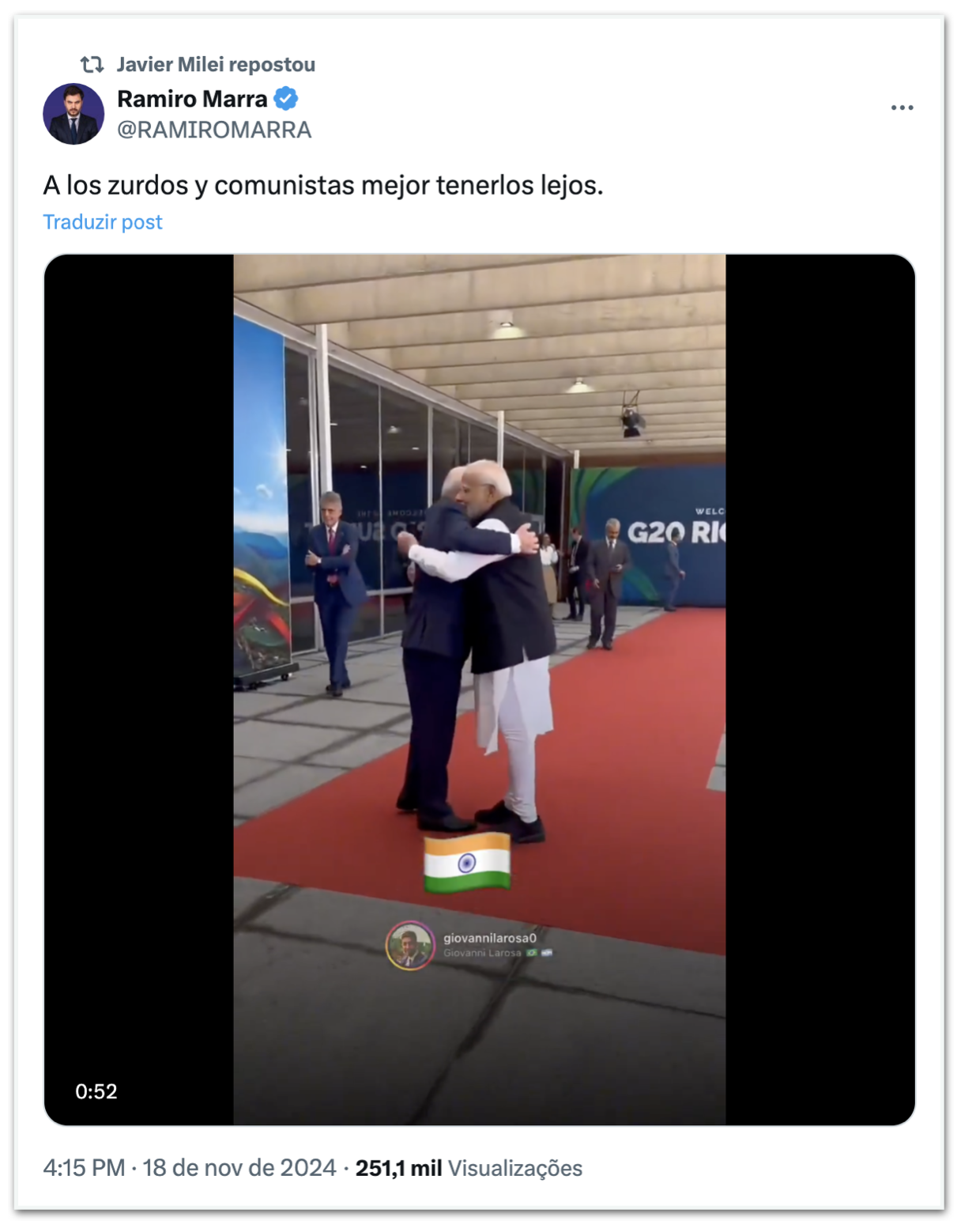A publicação mostra Lula cumprimentando outros líderes com apertos de mão e abraços sorridentes, como Emmanuel Macron (França), Narendra Modi (Índia) e Pedro Sánchez (Espanha). Na vez de Milei, o gesto é frio e protocolar. O vídeo corta então para o presidente argentino se encontrando com Jair Bolsonaro (PL) e o cumprimentando efusivamente.