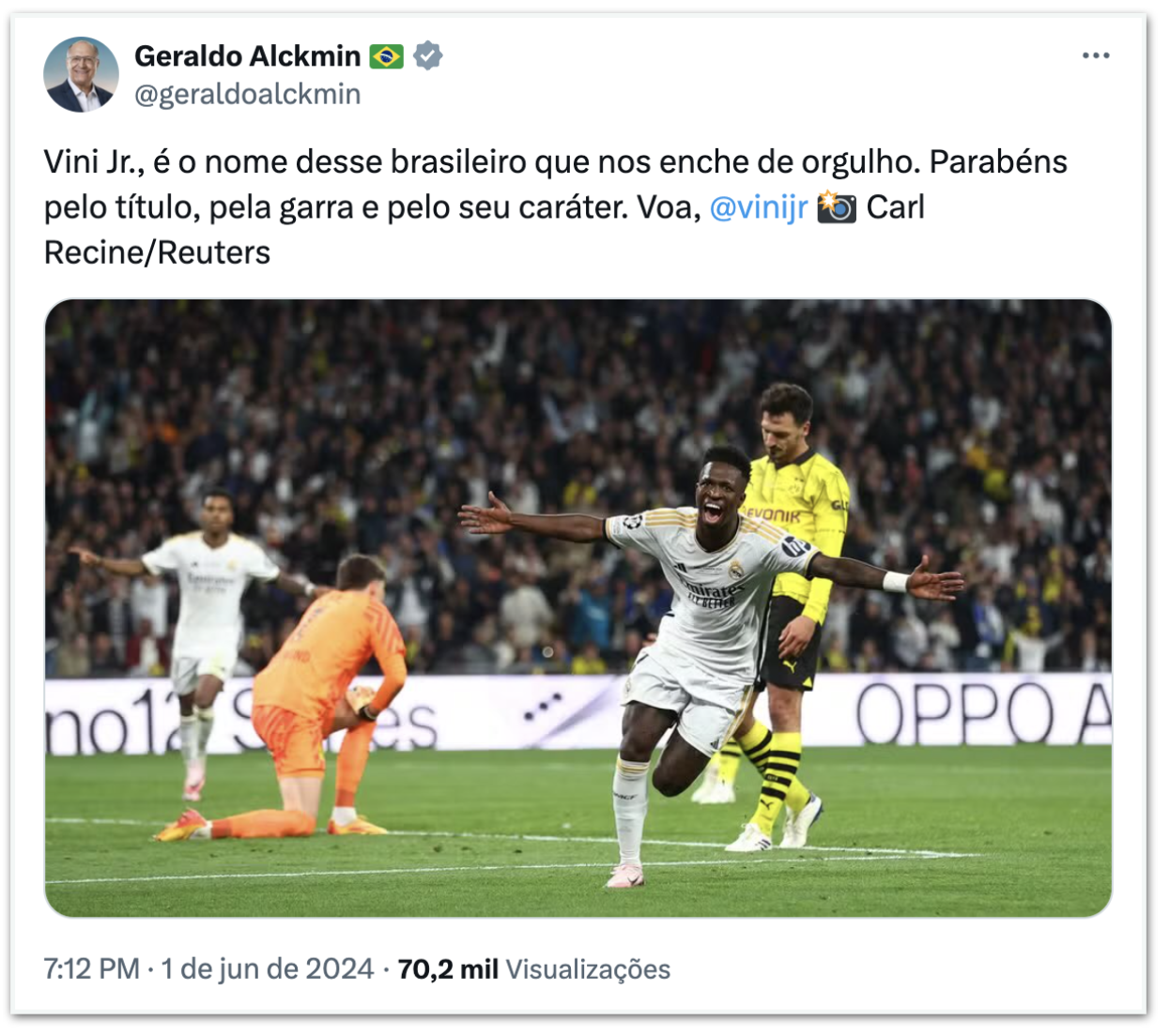 O vice-presidente e ministro do Desenvolvimento, Indústria e Comércio, Geraldo Alckmin, disse que Vini Jr. enche o país de orgulho.