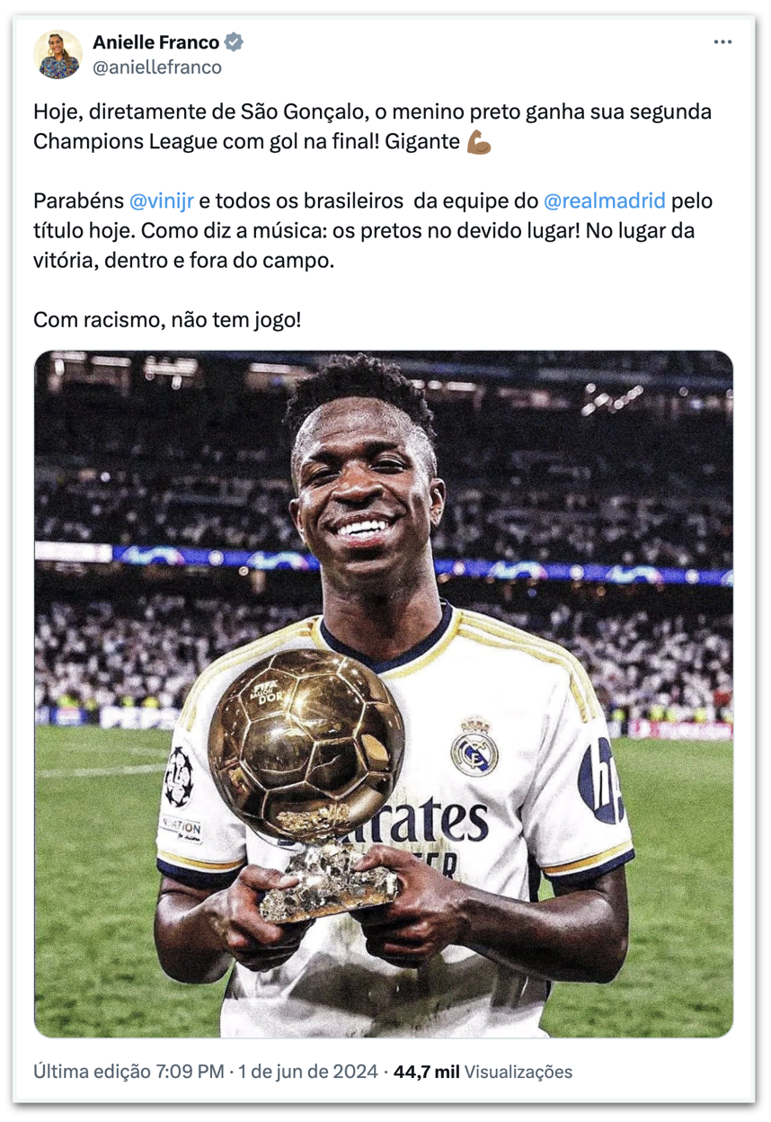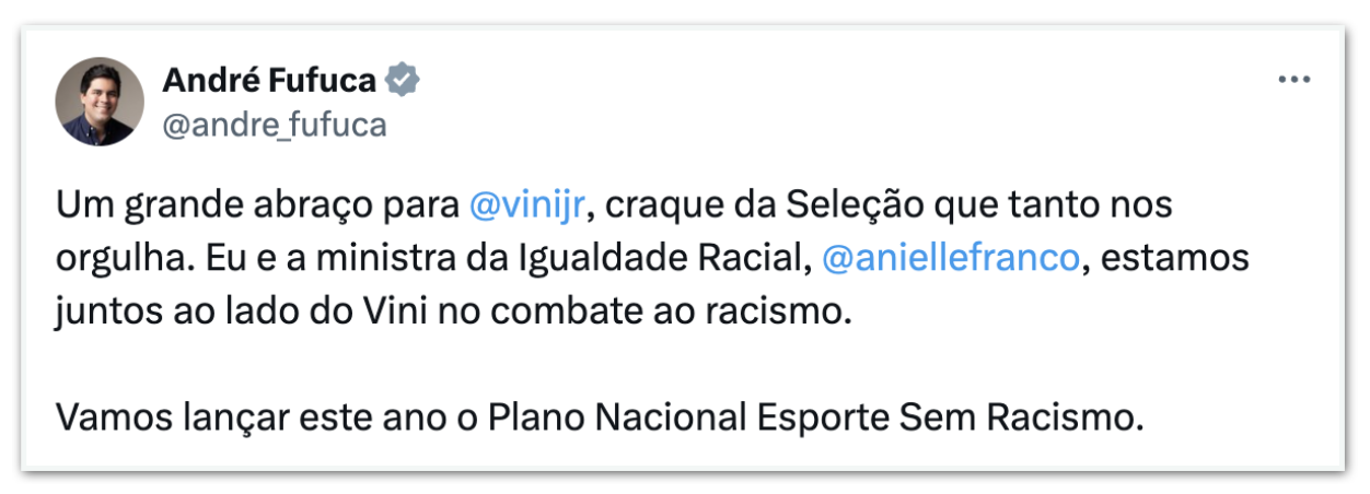 Um grande abraço para @vinijr, craque da Seleção que tanto nos orgulha. Eu e a ministra da Igualdade Racial, @aniellefranco, estamos juntos ao lado do Vini no combate ao racismo.
