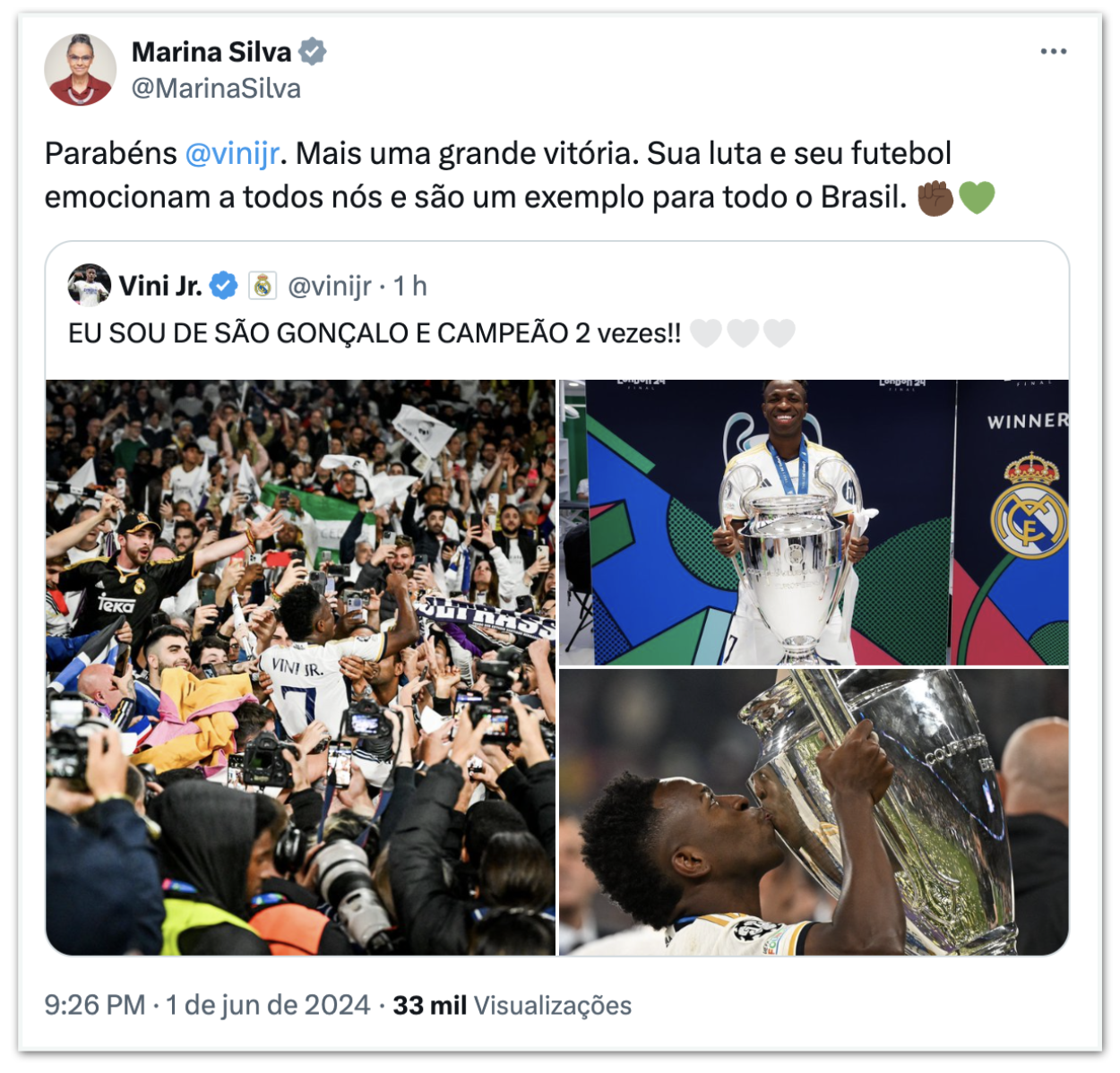 Marina Silva, ministra do Meio Ambiente e Mudança Climática republicou a postagem de comemoração de Vini Jr. e disse que a luta e o futebol do jogador “emocionam”.