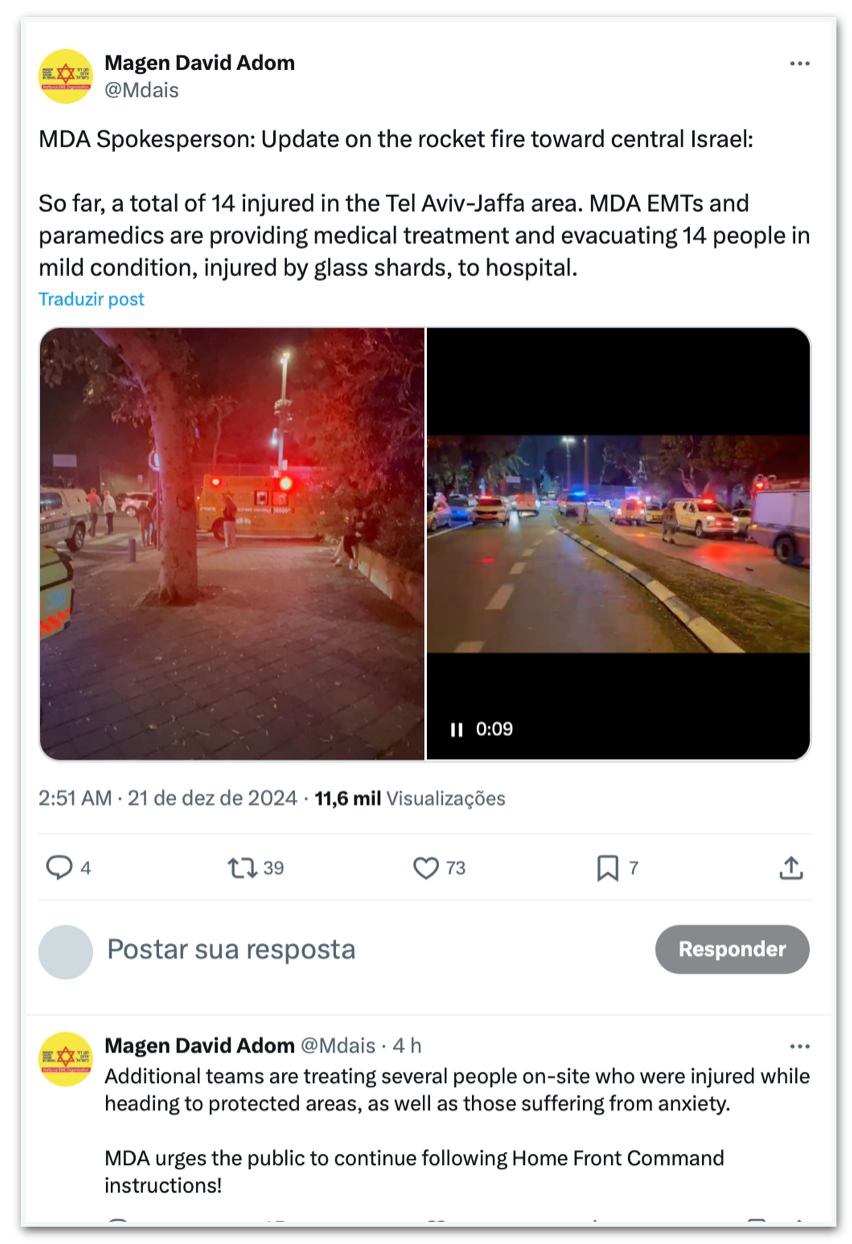 Um míssil lançado a partir do Iêmen caiu neste sábado (21.dez.2024) na área de Jaffa, em Tel Aviv. Segundo o MDA (Magen David Adom, o serviço nacional de emergência médica e desastres israelense), 14 pessoas ficaram feridas, mas sem gravidade.