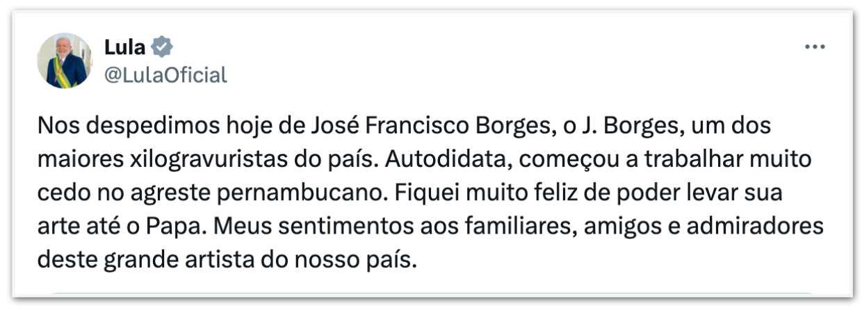 “Nos despedimos hoje de José Francisco Borges, o J. Borges, um dos maiores xilogravuristas do país. Autodidata, começou a trabalhar muito cedo no agreste pernambucano. Fiquei muito feliz de poder levar sua arte até o Papa. Meus sentimentos aos familiares, amigos e admiradores deste grande artista do nosso país”, afirmou o presidente.