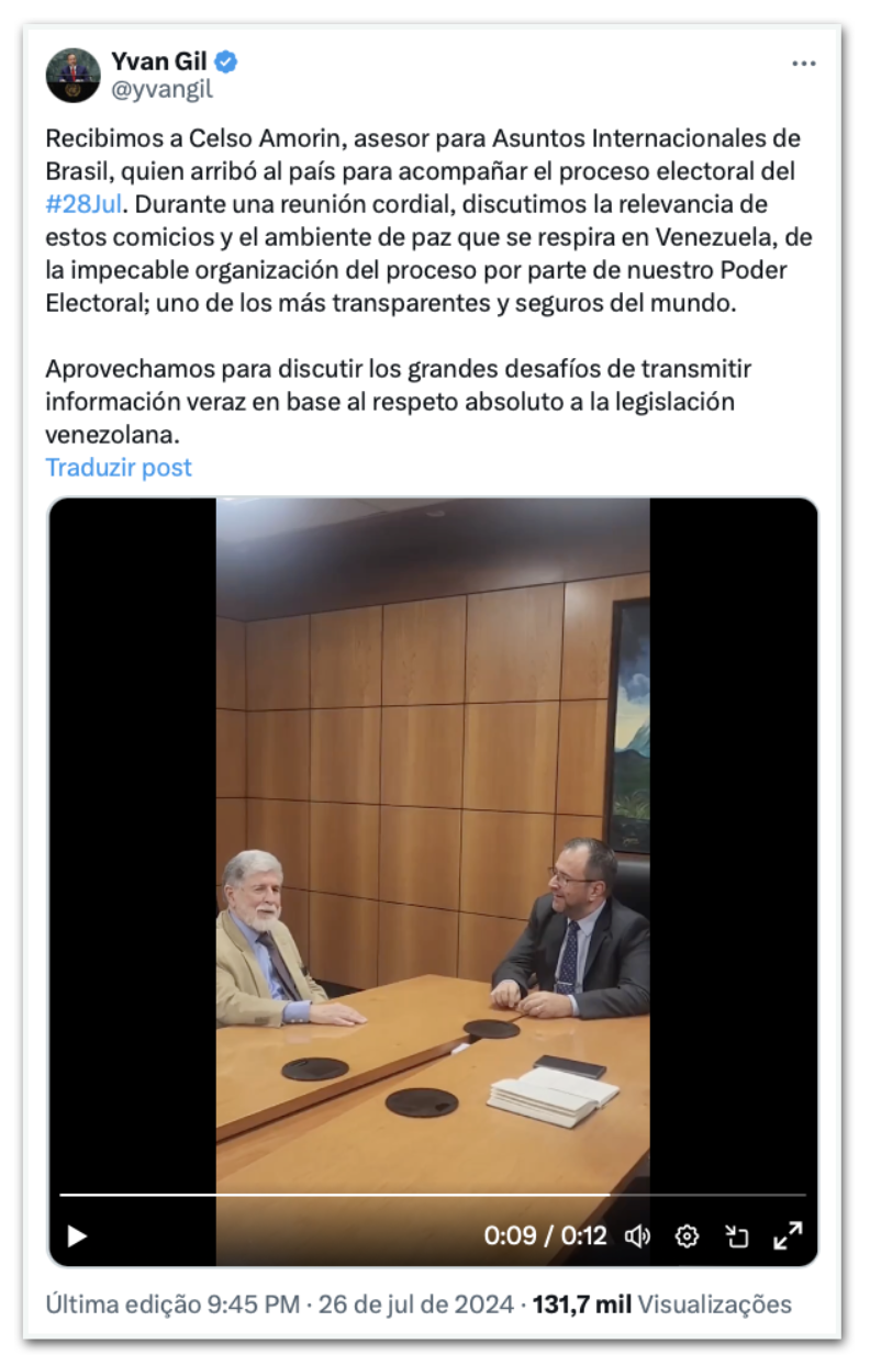 Amorim chegou à capital Caracas no início da noite de 6ª feira (26.jul.2024). Ainda no mesmo dia se encontrou com o chanceler venezuelano, Yvan Gil. Em seu perfil no X (antigo Twitter), Gil afirmou que a reunião foi cordial.