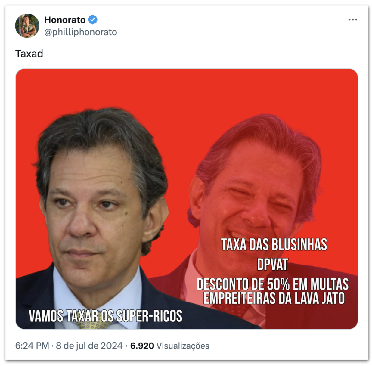 “Não vai pegar”, declarou Tatto, citado pelo jornal Folha de S.Paulo, sobre os memes. O secretário de Comunicação do PT afirmou que Haddad “está fortalecido” e vai ser conhecido como “aquele que desonerou”. Ele citou ações como a ampliação da isenção do IR (Imposto de Renda) e o cashback.