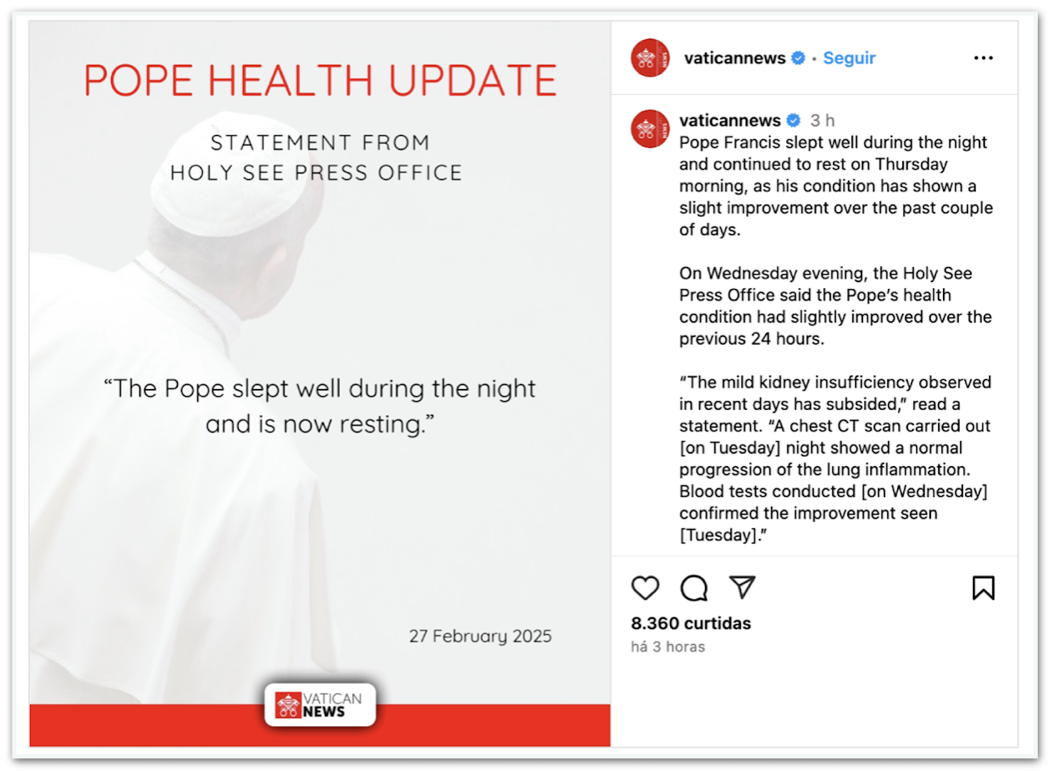 O Vaticano informou na manhã desta 5ª feira (27.fev.2025) que o papa Francisco, de 88 anos, “dormiu bem” e continua descansando.