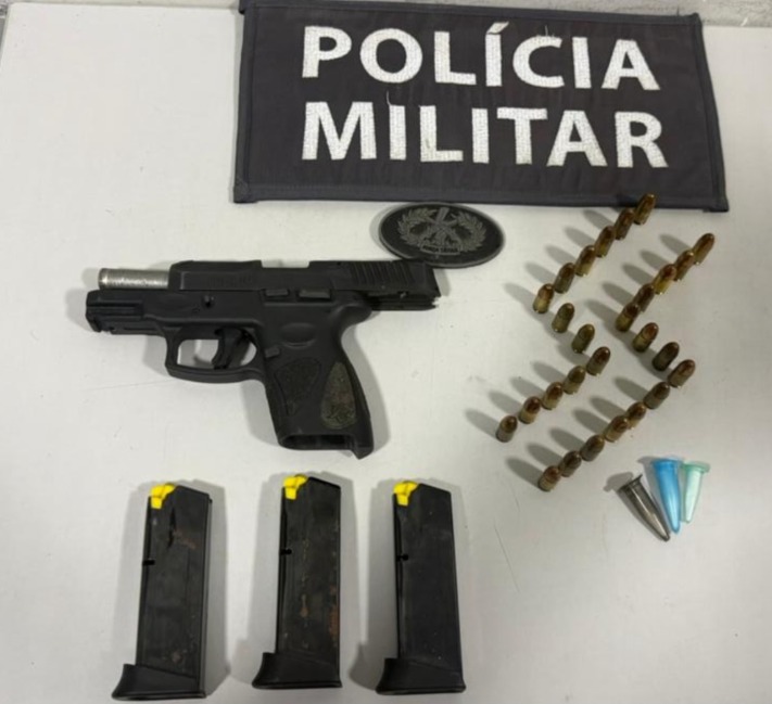No local, foi encontrada uma pistola calibre 9mm, acompanhada de três carregadores e 27 munições. Apesar de apresentar documentação da arma, os policiais verificaram que o registro estava vinculado a outro endereço, o que motivou a apreensão.