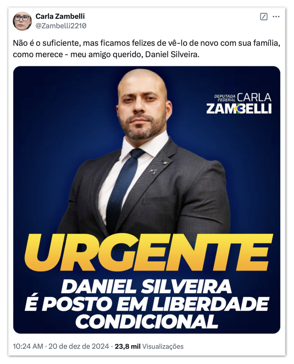 Apesar de não considerar o suficiente, a deputada federal Carla Zambelli (PL-SP) também expressou contentamento com a notícia: “Ficamos feliz de vê-lo de novo com sua família, como merece – meu amigo querido, Daniel Silveira”.