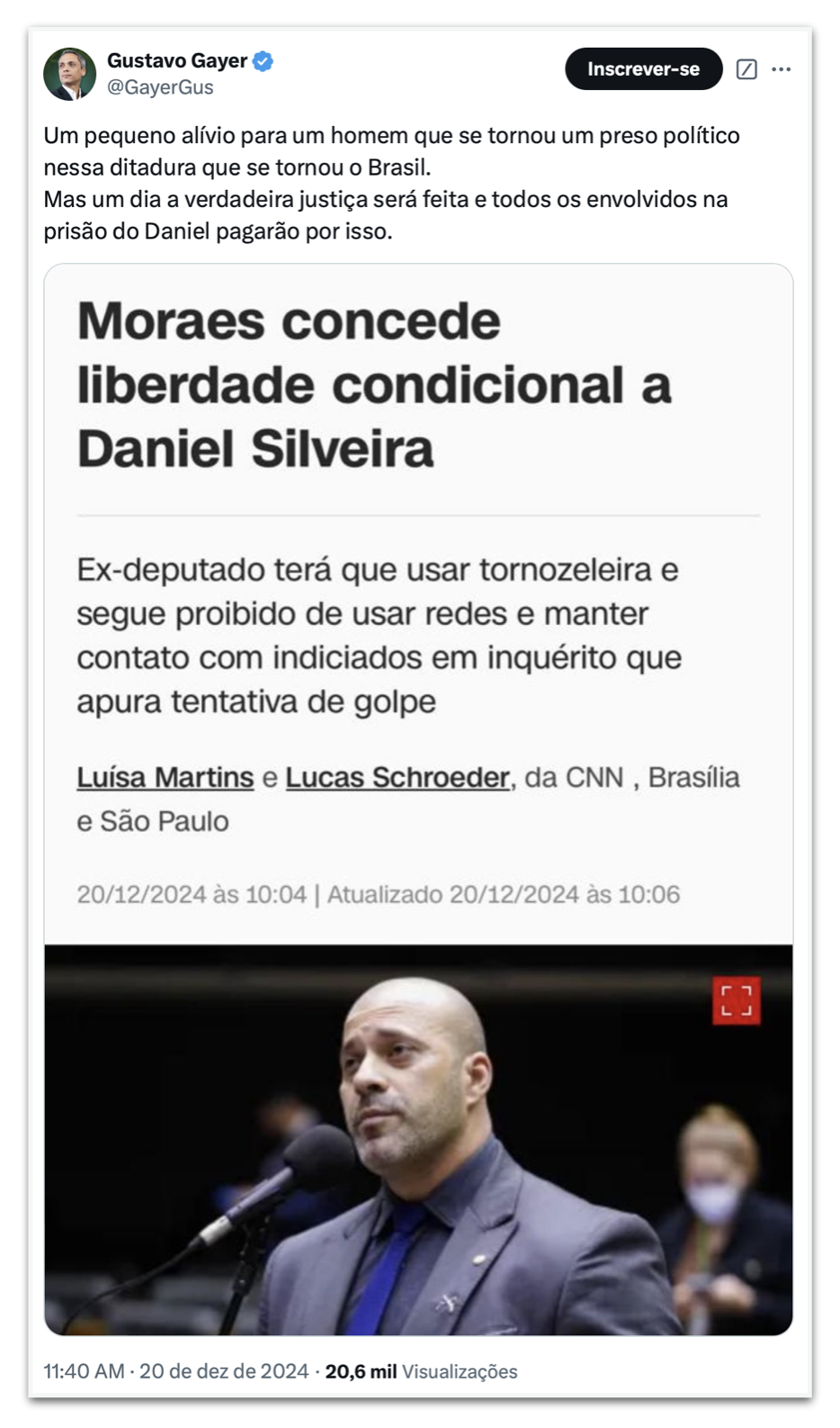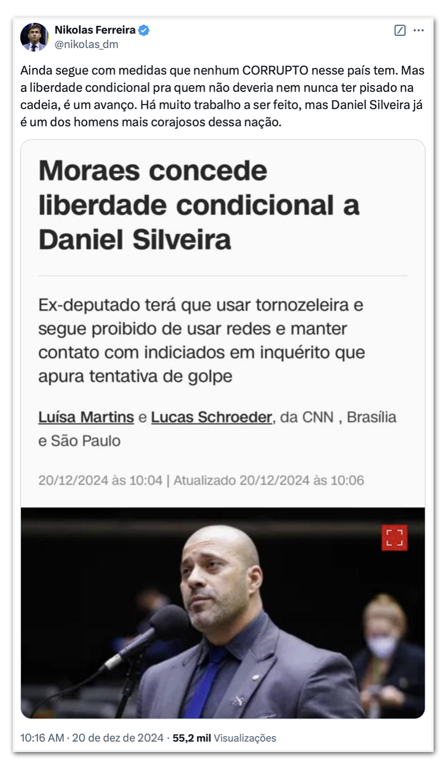 “[Silveira] Ainda segue com medidas que nenhum CORRUPTO nesse país tem. Mas a liberdade condicional para quem não deveria nem nunca ter pisado na cadeia, é um avanço”, disse Nikolas.