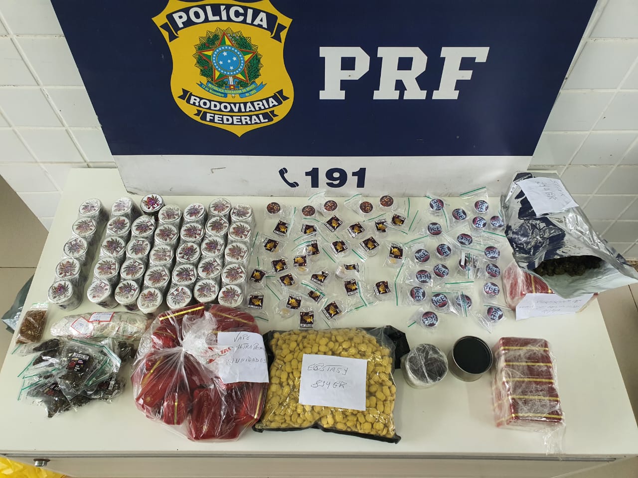skunk – um saco prateado com 294g, 20 embalagens de 1g, 35 potes totalizando 1.796g; ecstasy – 1 saco selado com 814g em ccomprimidos; haxixe – 2 potes selados com 34 g; vapes de maconha – 40 unidades da marca Ace Ultra Premium, maconha gourmet ICE 20 potes totalizando 126 g: maconha MEL (resina concentrada) – 60 embalagens totalizando 62g, 29 potes totalizando 188g; maconha comum – pequena sacola com 4g.