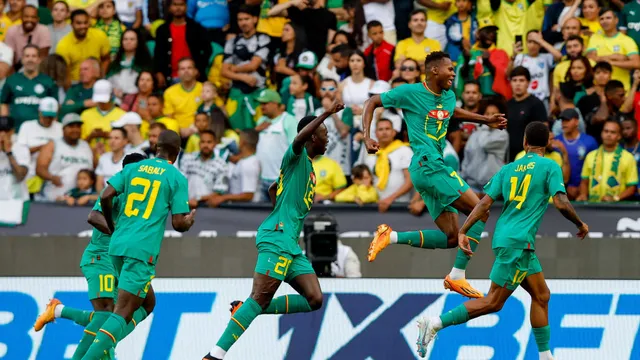 Jogadores de Senegal comemoram gol sobre o Brasil (Foto: Joao Rico/DeFodi Images via Getty Images)