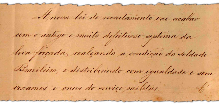 Trecho do documento original da Fala do Trono de 1874 em que d. Pedro 2º agradece ao Parlamento a aprovação da lei do sorteio militar: “A nova lei de recrutamento vai acabar com o antigo e muito defeituoso sistema da leva forçada”